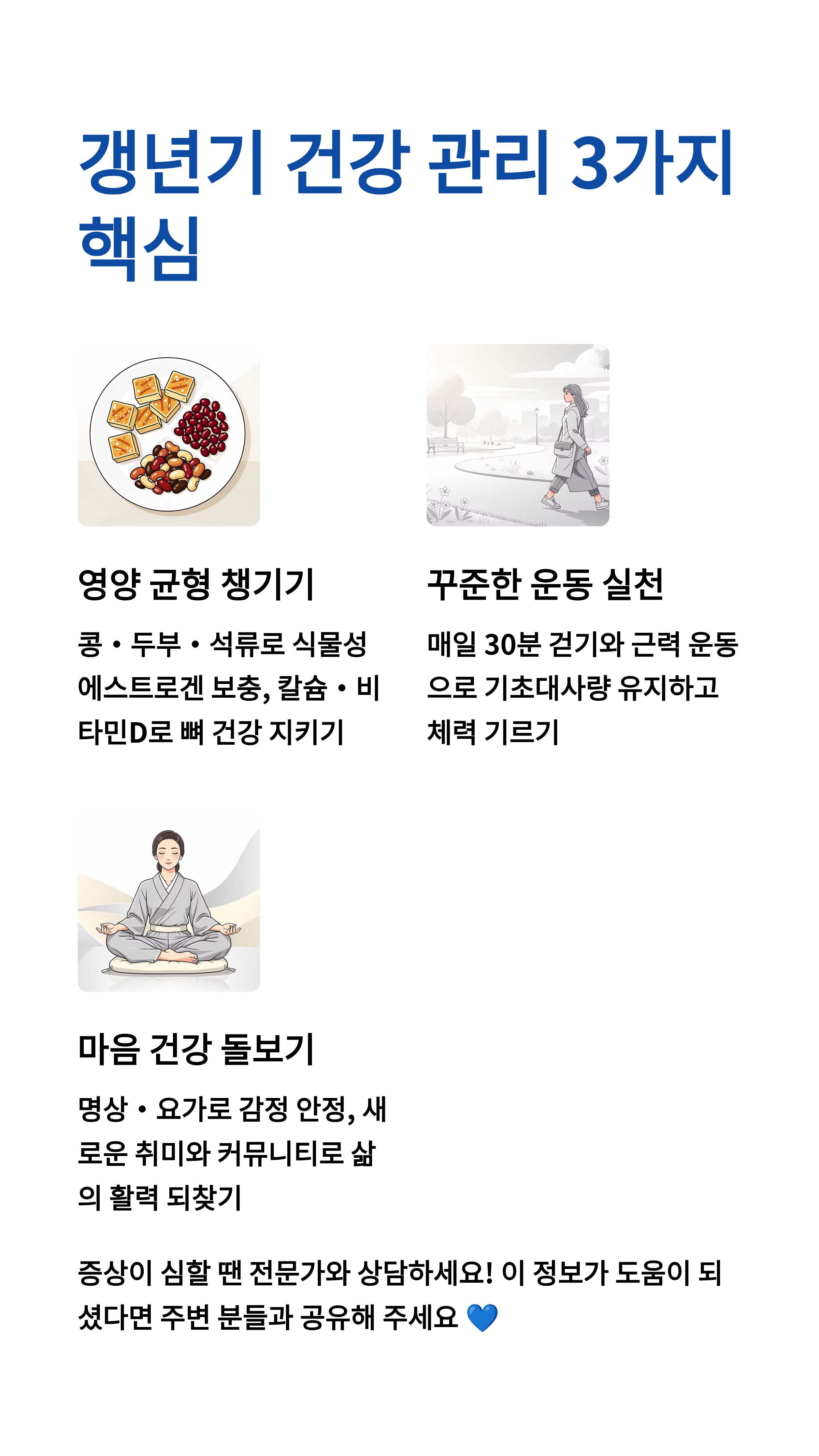 갱년기는 끝이 아닌 새로운 시작입니다. 나 자신을 더 사랑하고 아끼는 시간으로 만들어보시길 진심으로 응원합니다. 혹시 여러분만의 갱년기 극복 노하우가 있나요? 아니면 더 궁금한 점이 있으신가요? 댓글로 자유롭게 이야기를 나누어보아요! 제가 정성껏 답변해 드릴게요~ 😊