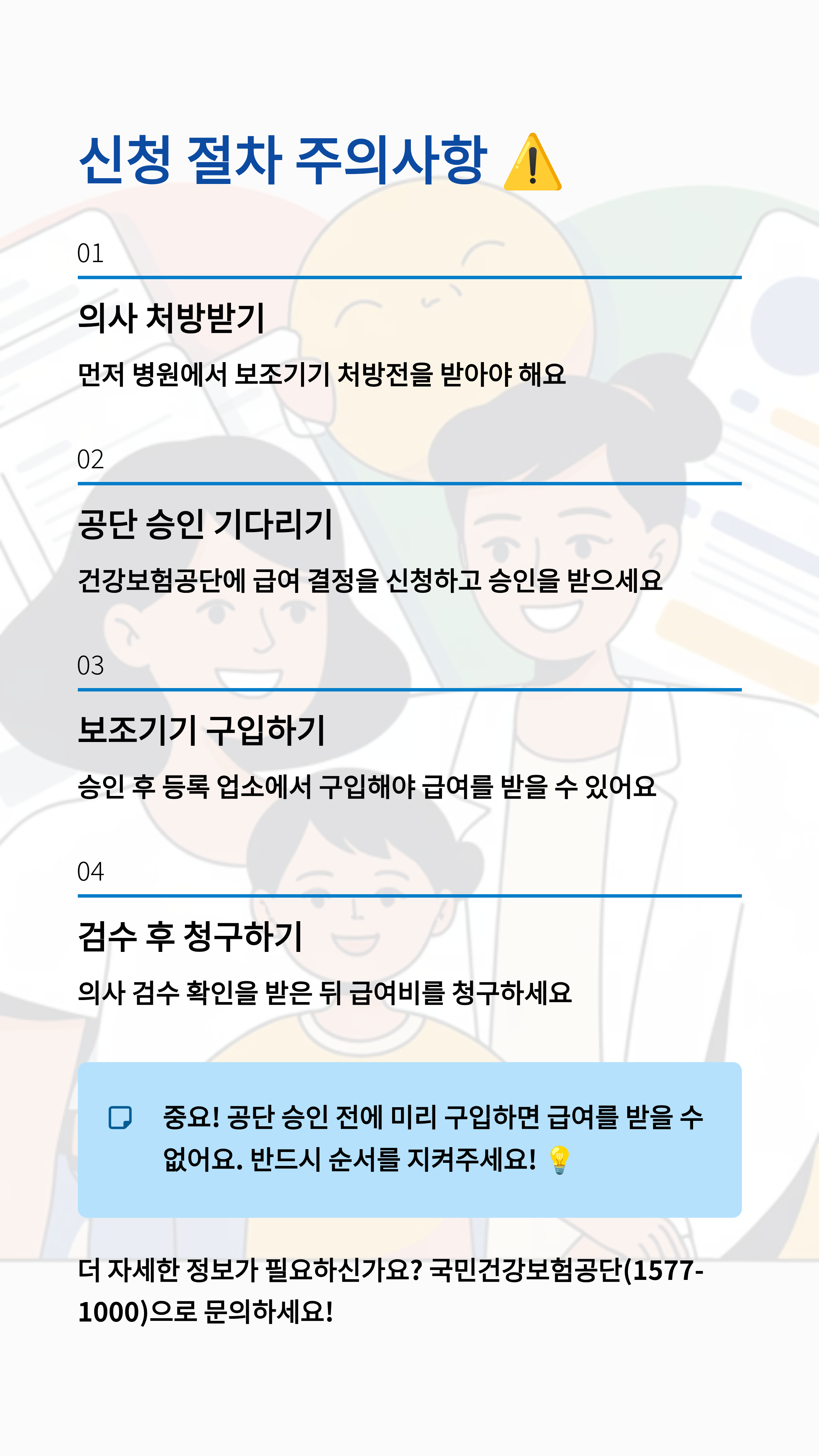 - **선 구입은 NO!** 반드시 **급여 결정(승인)**을 받은 후, **등록된 업소**에서 구입해야 급여를 청구할 수 있습니다.