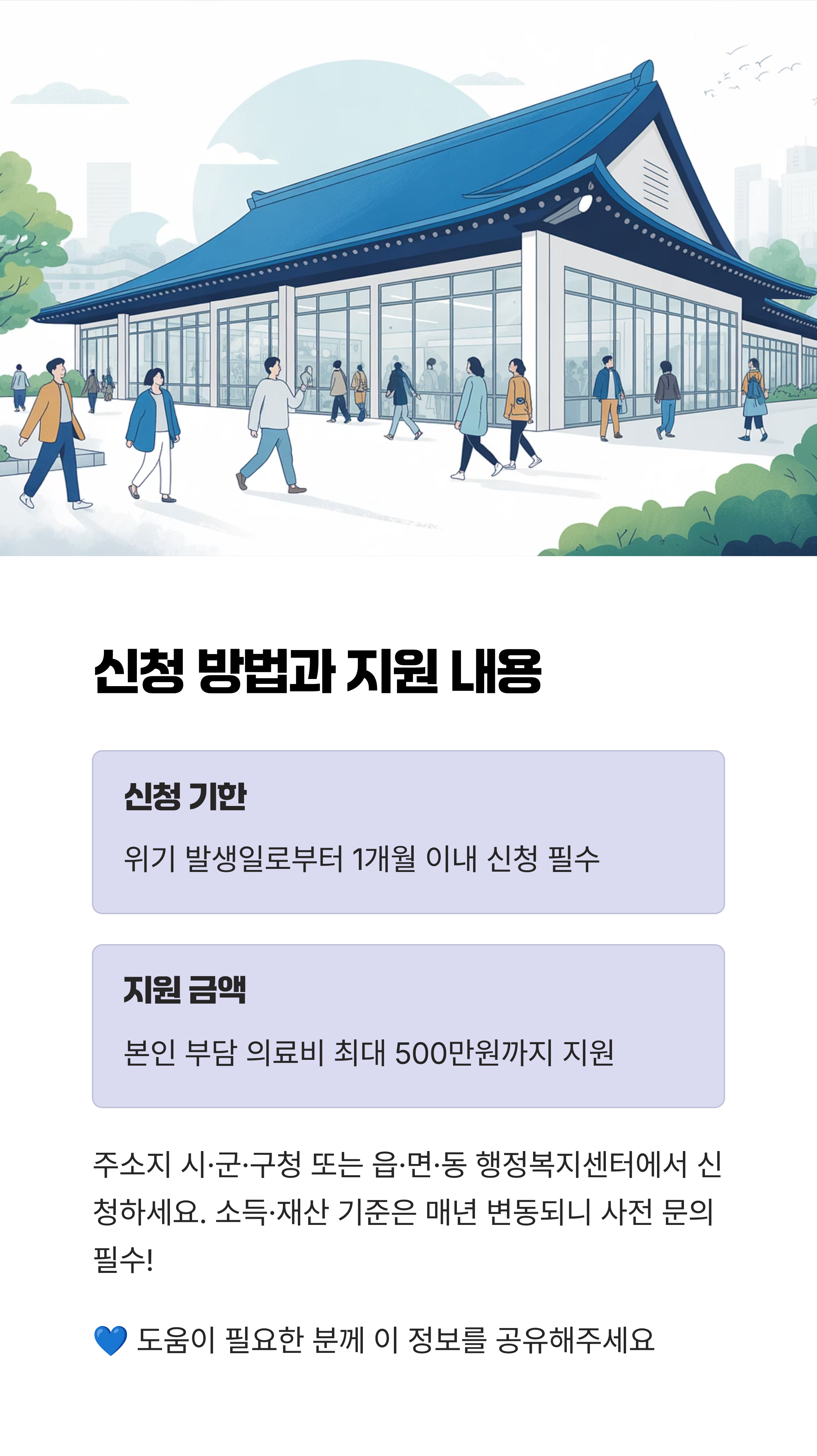 이 제도는 '생계' 지원이 아닌 '의료비' 지원에 특화되어 있다는 점을 꼭 기억하세요! 위기 사유 발생일로부터 1개월 이내에 신청해야 한다는 시간적 제약이 있으니, 위기에 처했다면 신속하게 움직여야 합니다.