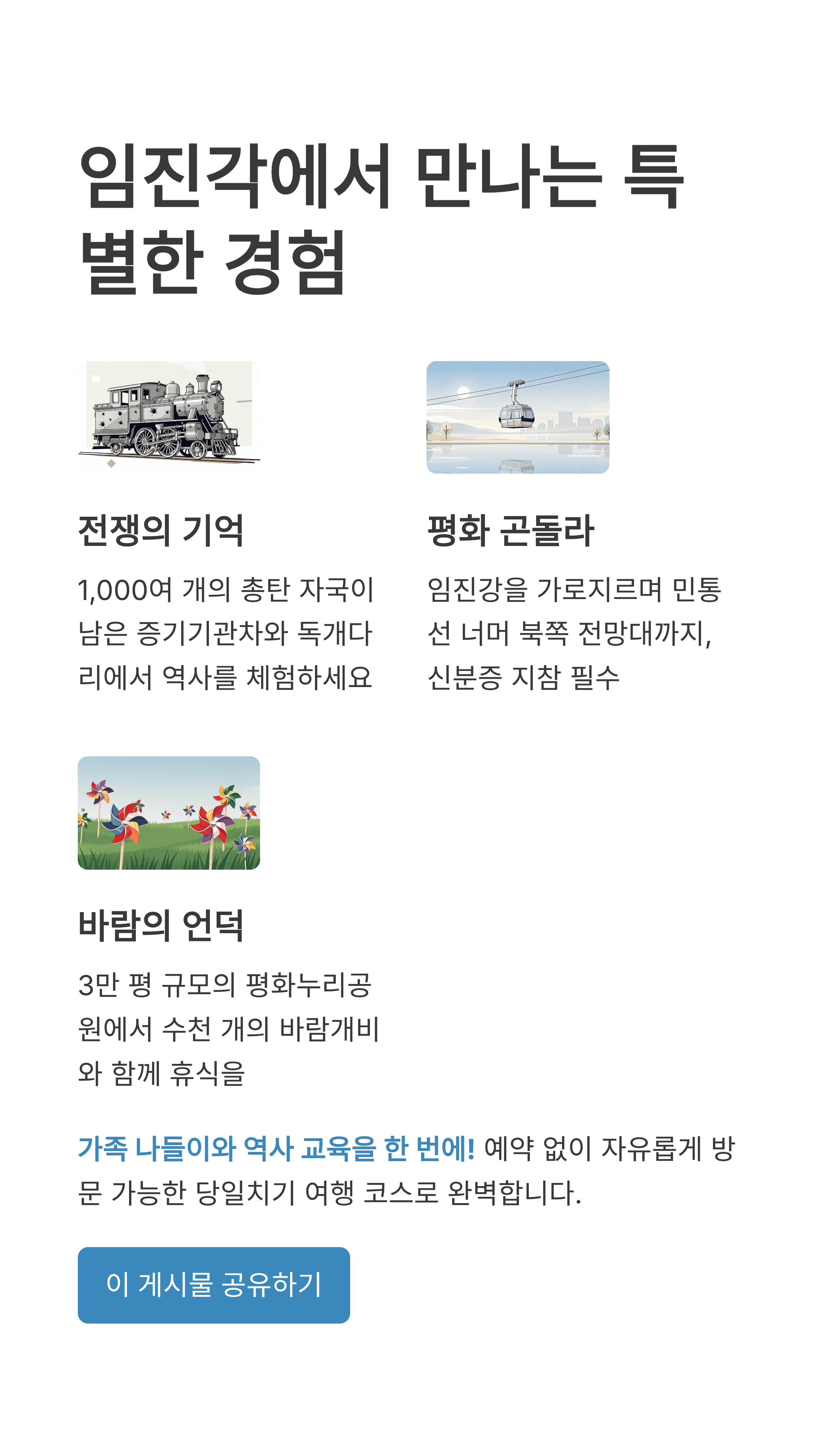 실제로 임진각을 방문한 가족의 사례를 통해 어떤 일정이 가장 효율적인지 살펴볼까요? 40대 가장 박모모 씨의 하루 코스를 재구성해 봤습니다.