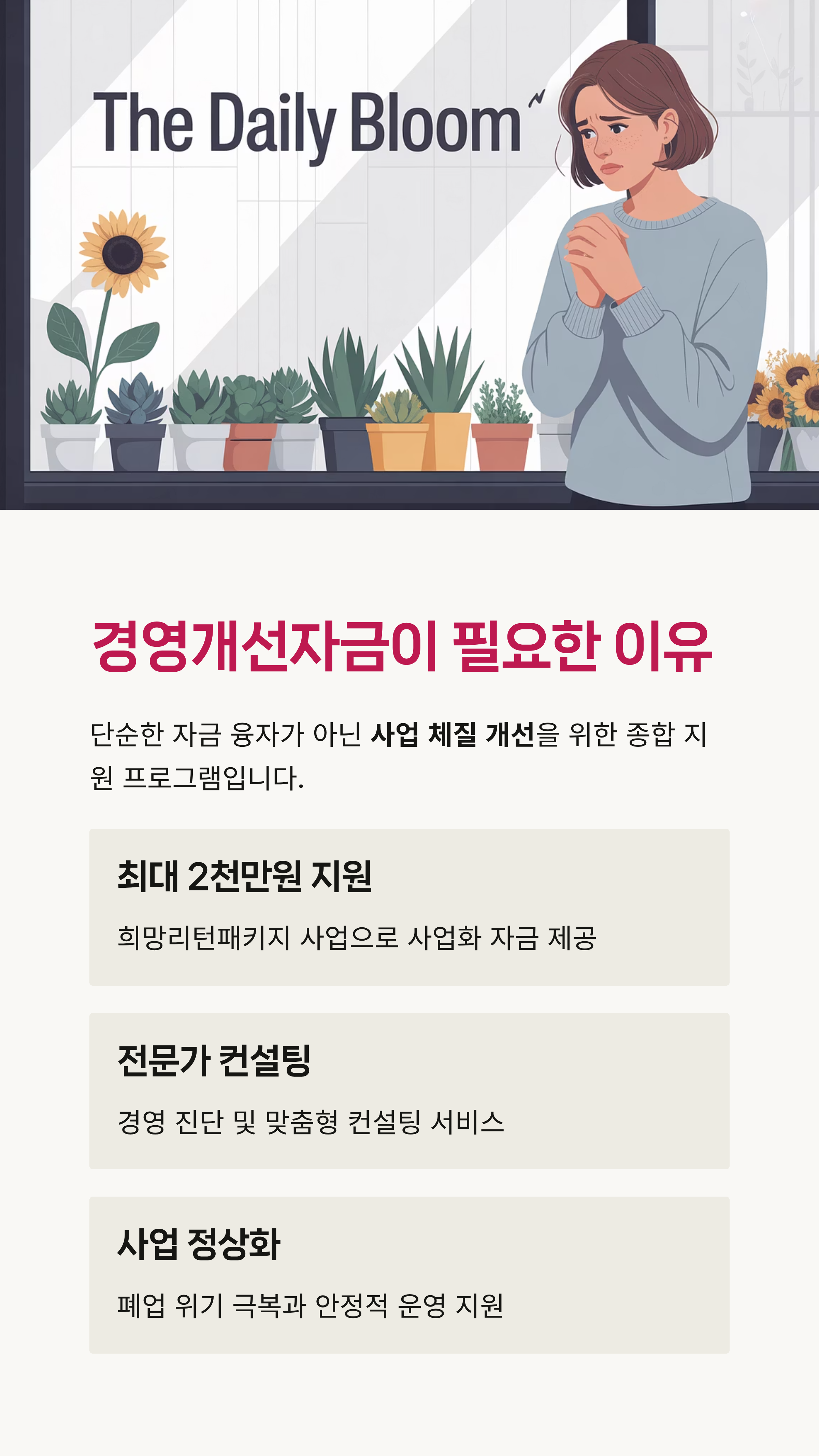 이처럼 경영개선자금은 단순히 자금을 지원하는 것을 넘어, 사업의 문제점을 진단하고 해결책을 제시해 주는 맞춤형 솔루션이라고 볼 수 있어요. 박모모씨의 사례처럼 여러분도 이 기회를 통해 새로운 활로를 개척할 수 있습니다!