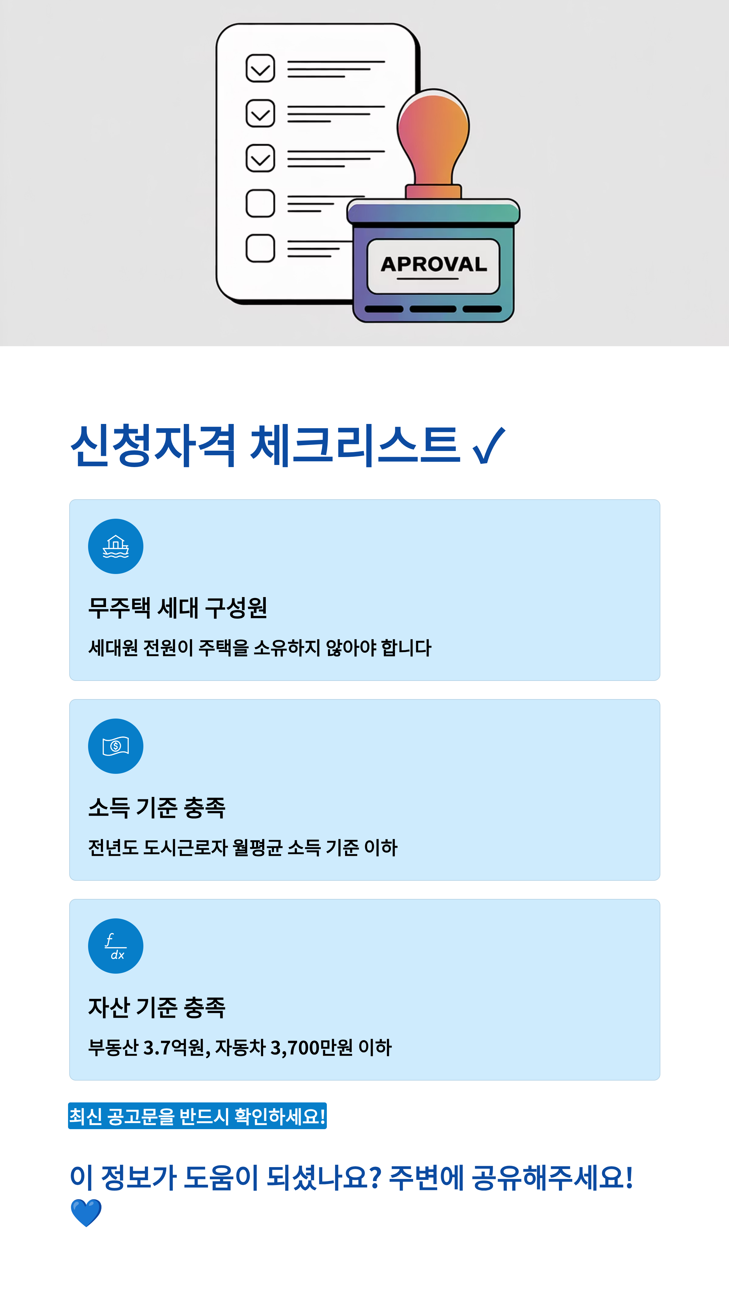 5. **다섯 번째 핵심 포인트:** 내가 신청하고자 하는 **최신 공고문의 소득/자산 기준**을 반드시 확인하는 것이 중요합니다!