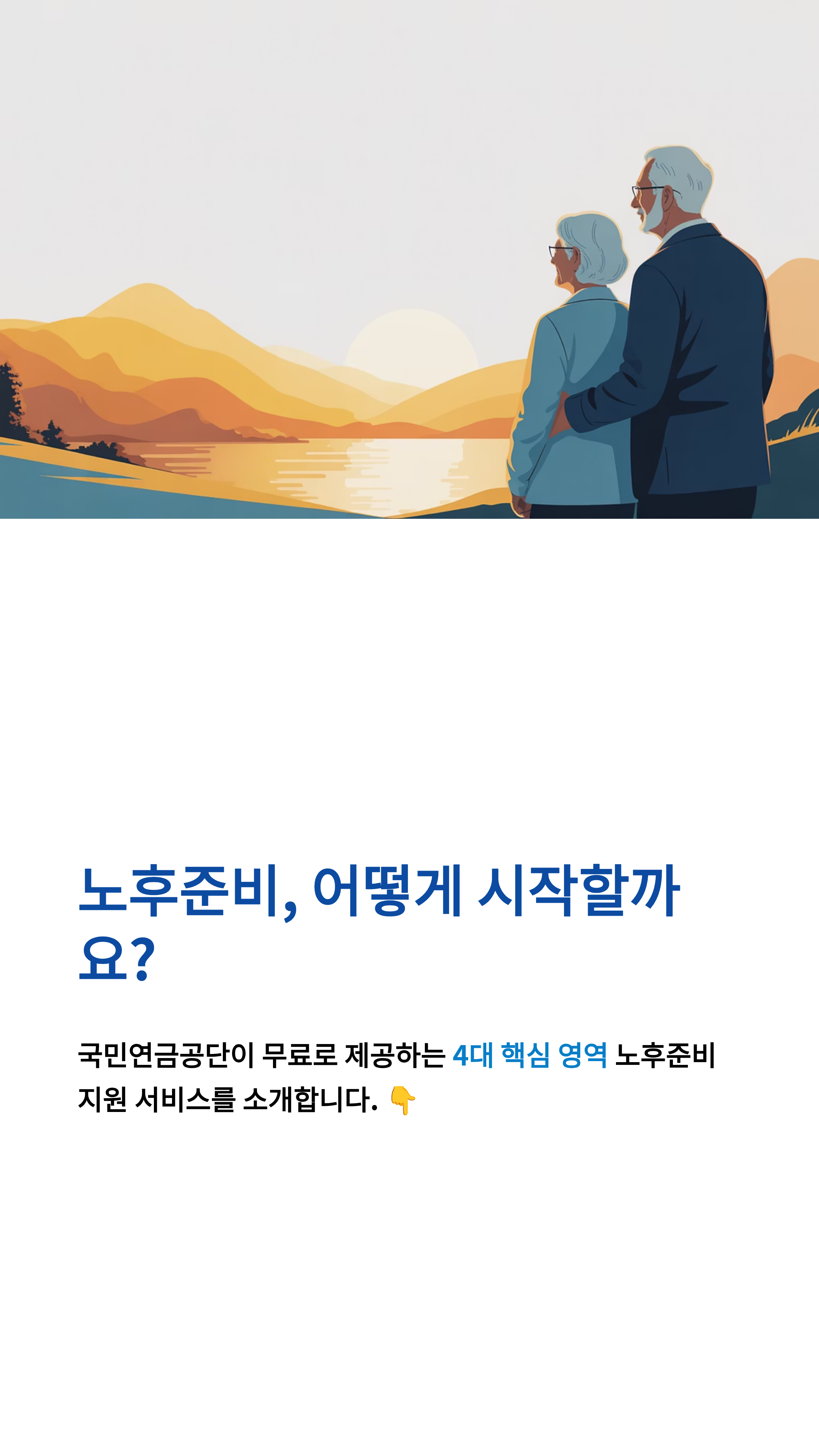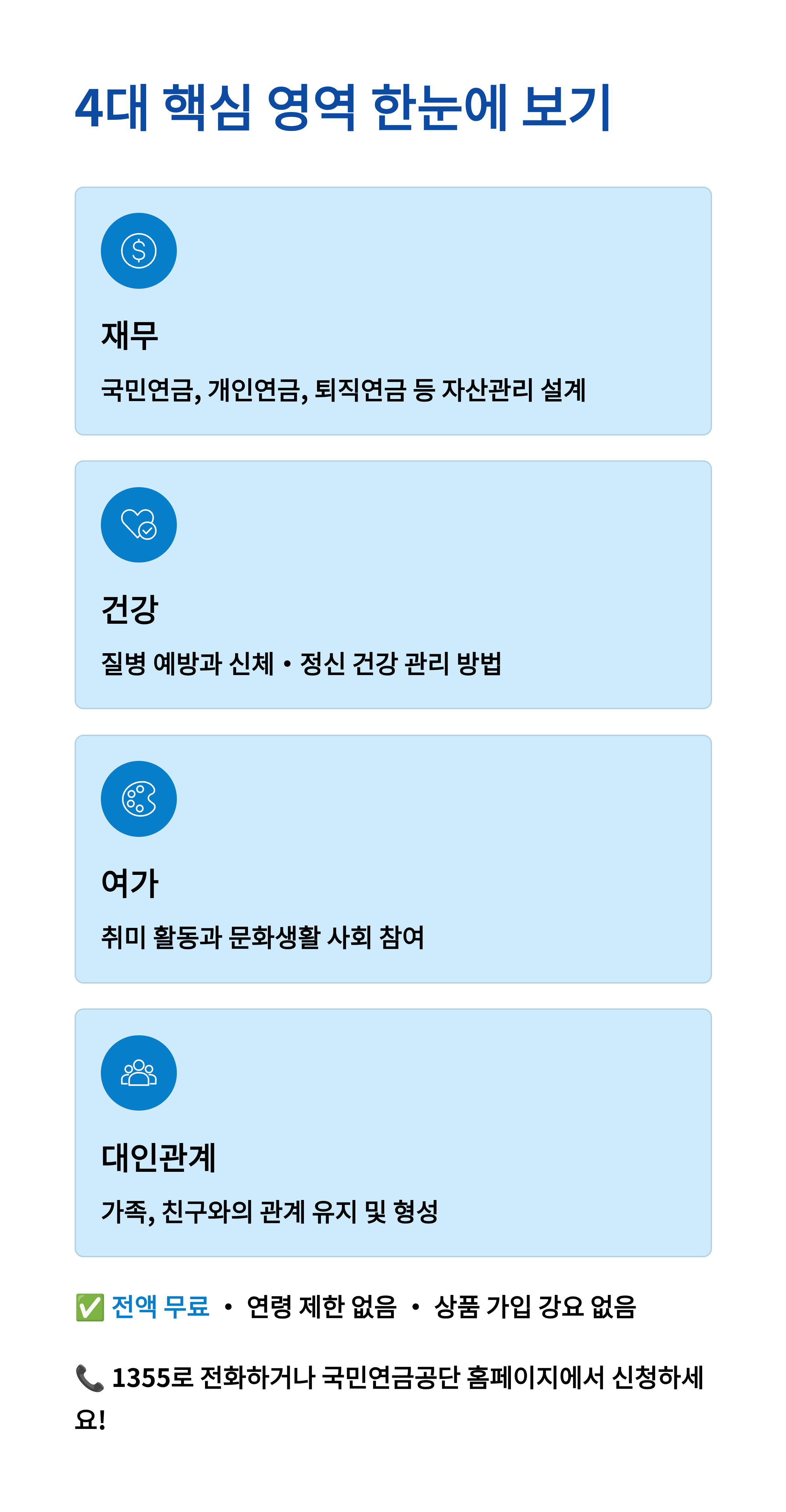 노후준비 지원 서비스는 다음 네 가지 영역에 대한 진단과 상담을 제공해요. 시각적으로 구분되어 독자의 주의를 끌 수 있는 내용을 넣으세요.