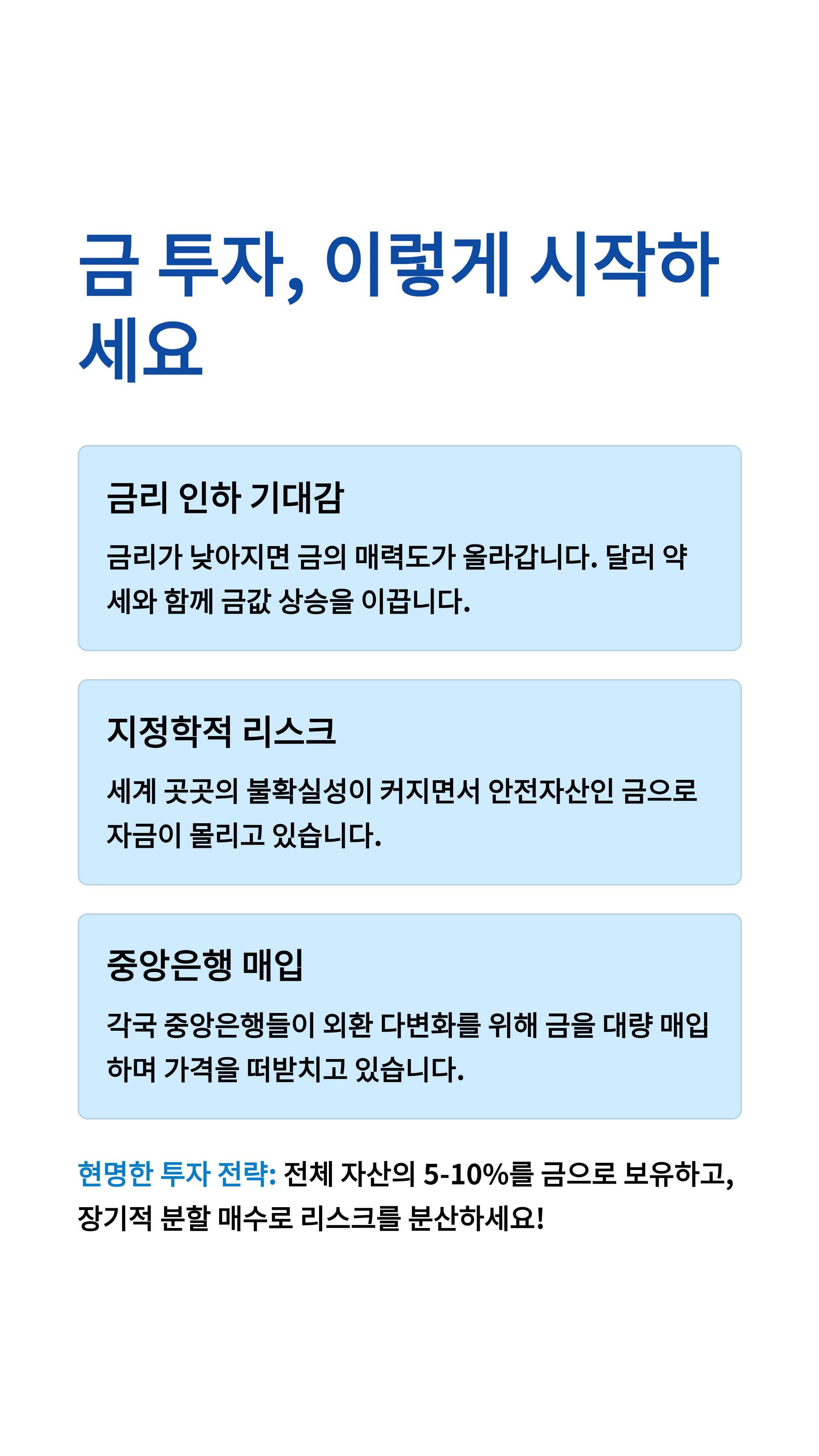 - 장기적 관점 유지: 금은 단기적인 시세차익보다는 불확실한 시대에 포트폴리오의 방어적 자산으로 활용하는 것이 좋아요. 전체 자산의 5%~10% 정도를 금으로 보유하는 것을 전문가들은 권장합니다.