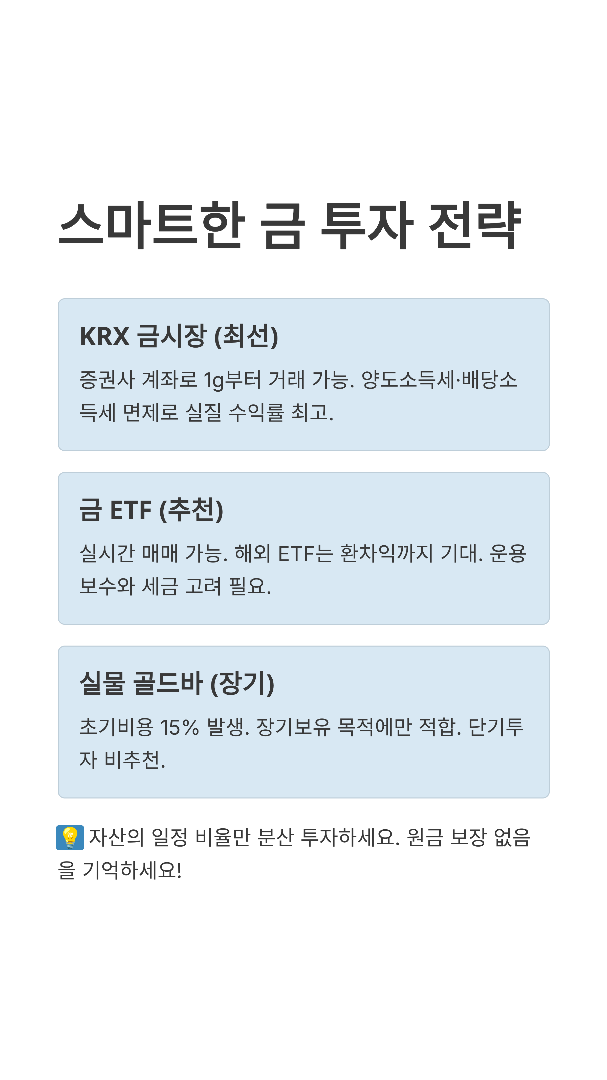 지금까지 안전하게 금 투자하는 5가지 방법을 알아보았는데요, 핵심만 딱 정리해 드릴게요!