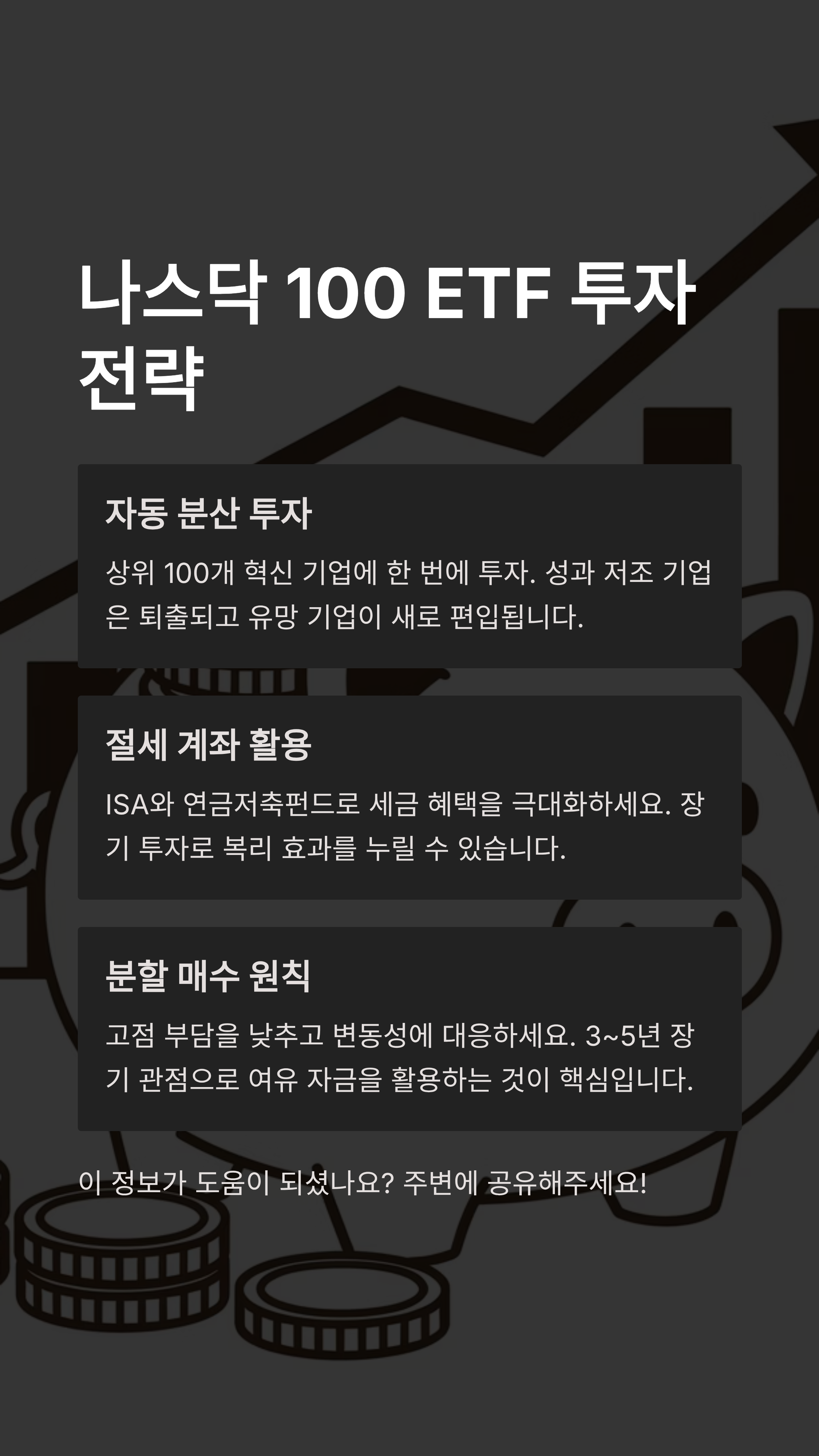 - 절세 계좌를 활용하세요. ISA나 연금저축펀드를 통해 나스닥 ETF에 투자하면 세금을 크게 아낄 수 있습니다.