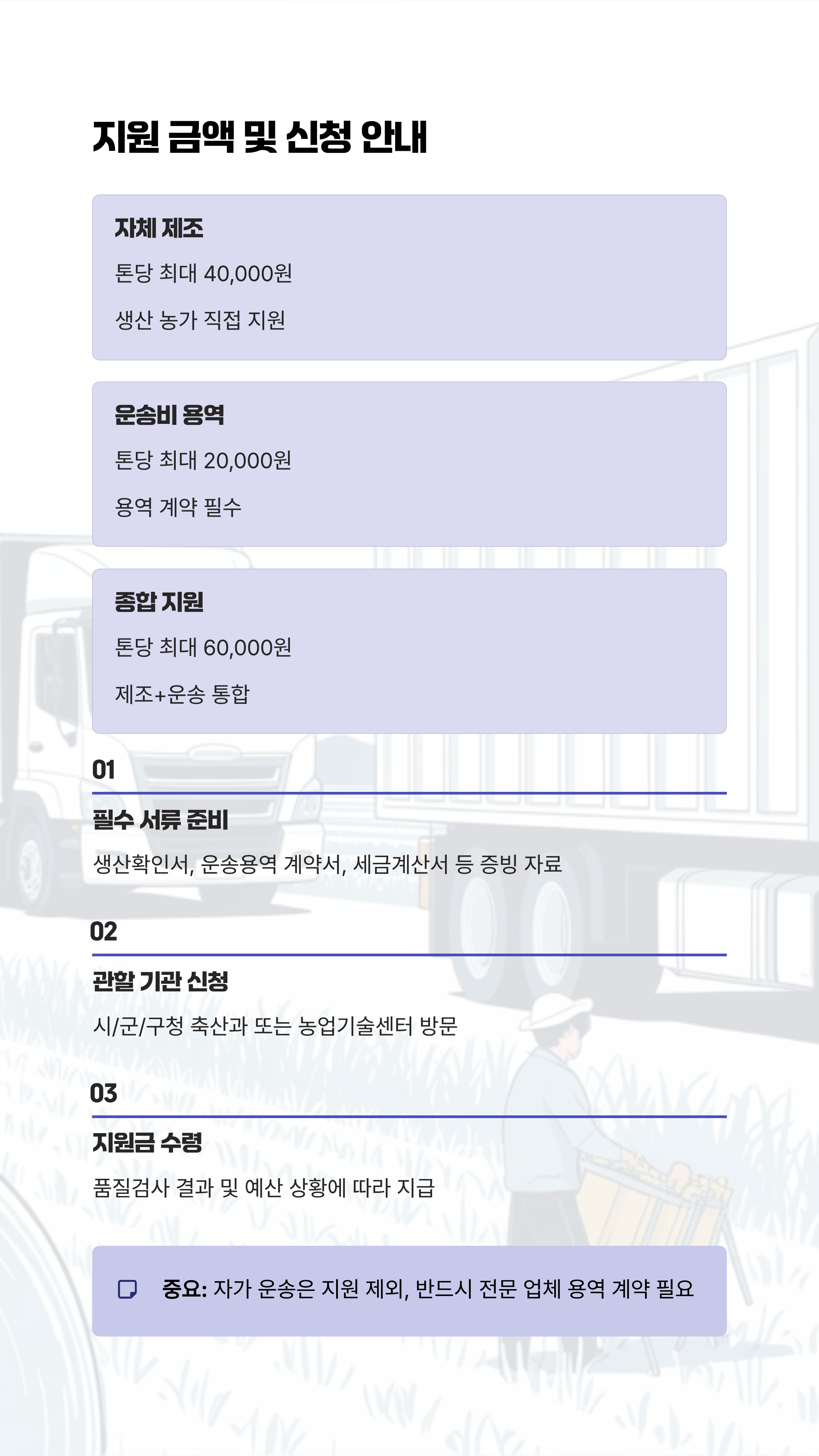 | 종합 지원 (제조+운송) | 최대 60,000원/톤 | 직접 생산 및 타 농가 운송/판매 시 | 제조 및 운송 모두 증빙 필요 |