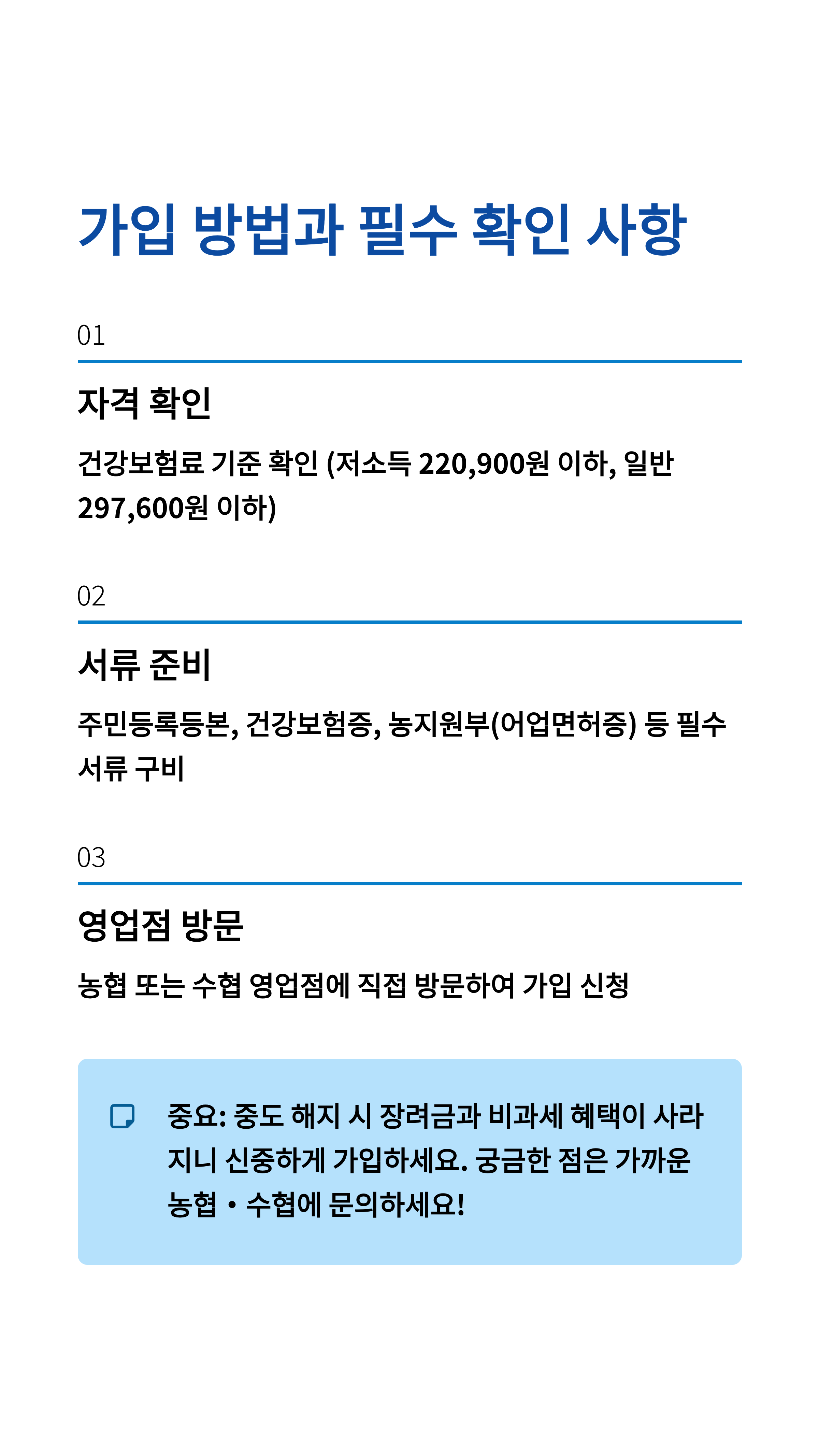 - **다섯 번째 핵심 포인트: 농·수협 등 방문 필수.** 온라인 가입이 불가하며, 필수 서류를 지참하여 취급 금융기관을 방문해야 합니다.