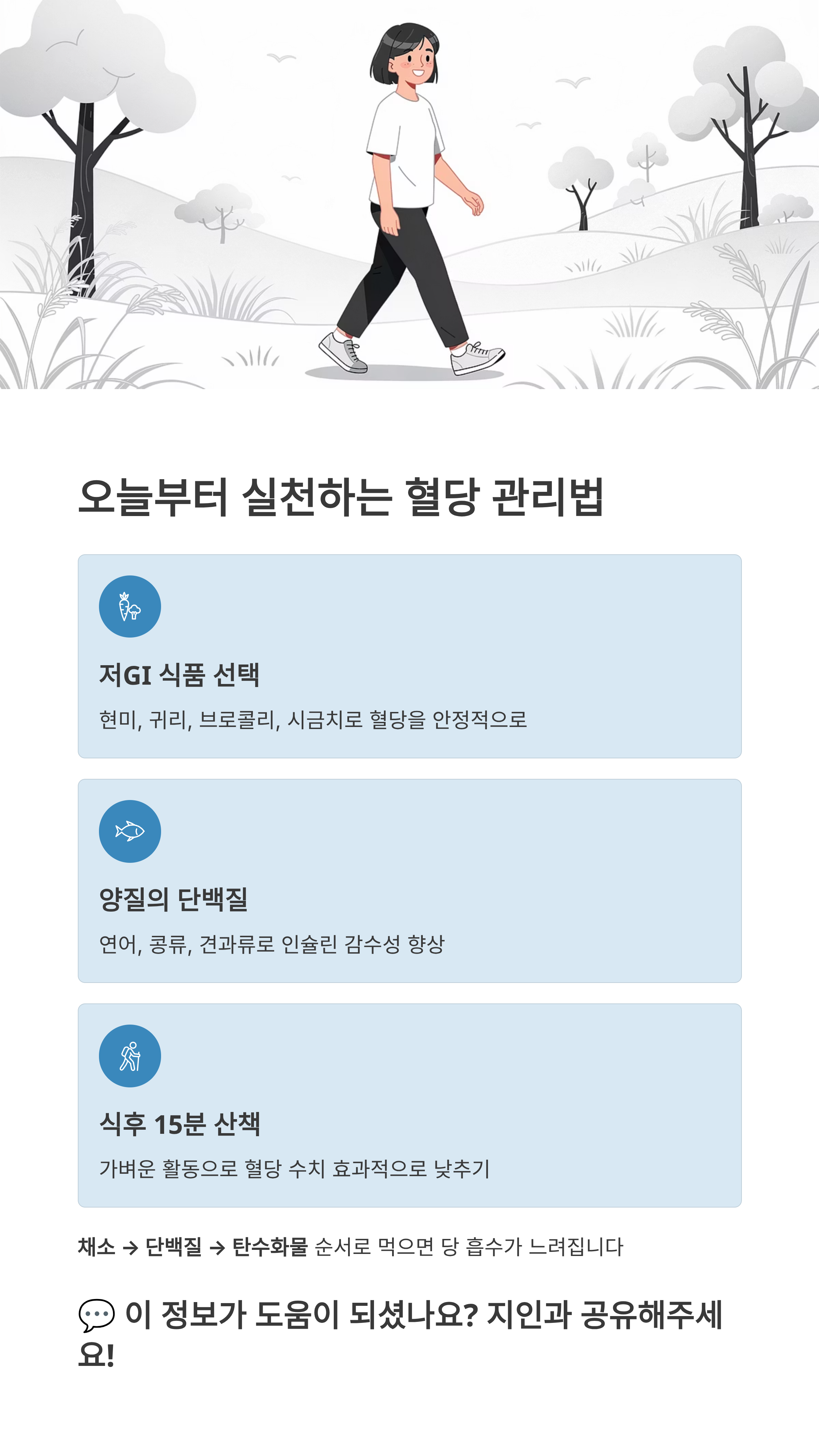 - 식후 걷기 생활화. 가벼운 운동은 인슐린 효율을 극대화합니다.