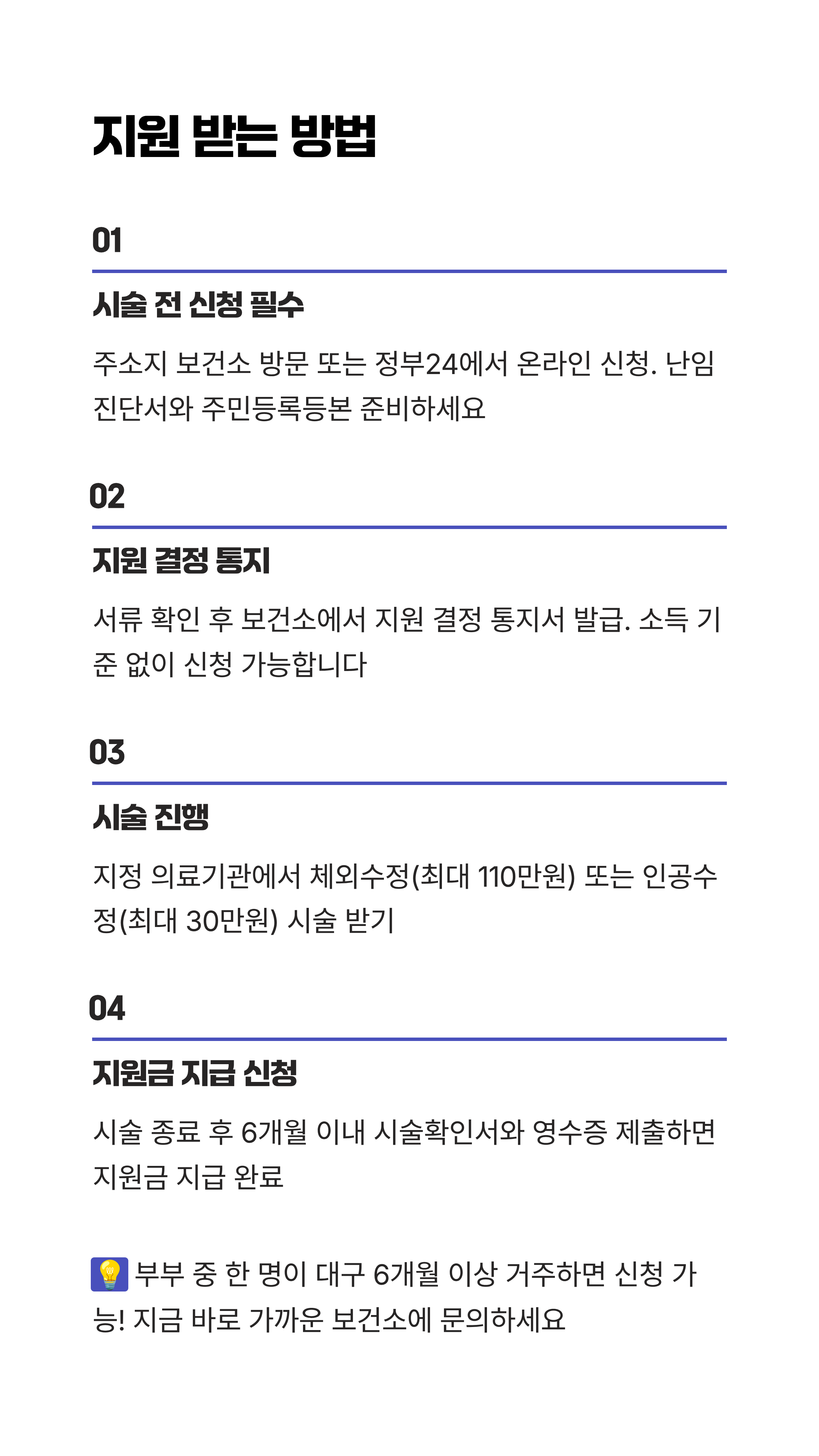 - 네 번째 핵심 포인트. **시술 시작 전에** 반드시 주소지 관할 보건소에 신청해야 지원금을 받을 수 있습니다.