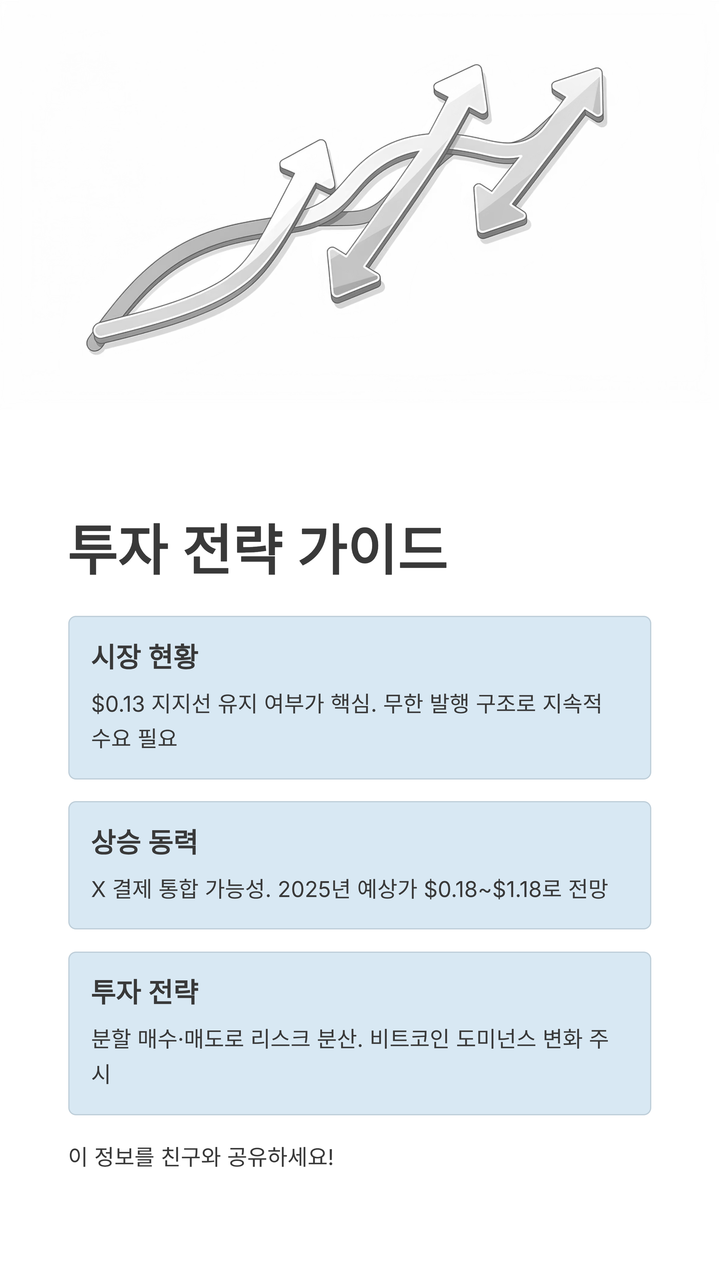 전문가들은 단기적으로 $0.13(약 180원) 지지선이 유지되는지가 가장 중요하다고 보고 있습니다. 이 지지선만 잘 버텨준다면 다시 전고점을 향해 랠리를 펼칠 가능성이 크거든요. 반대로 이 선이 깨진다면 추가적인 하락이 올 수 있으니 주의 깊게 관찰해야 합니다.