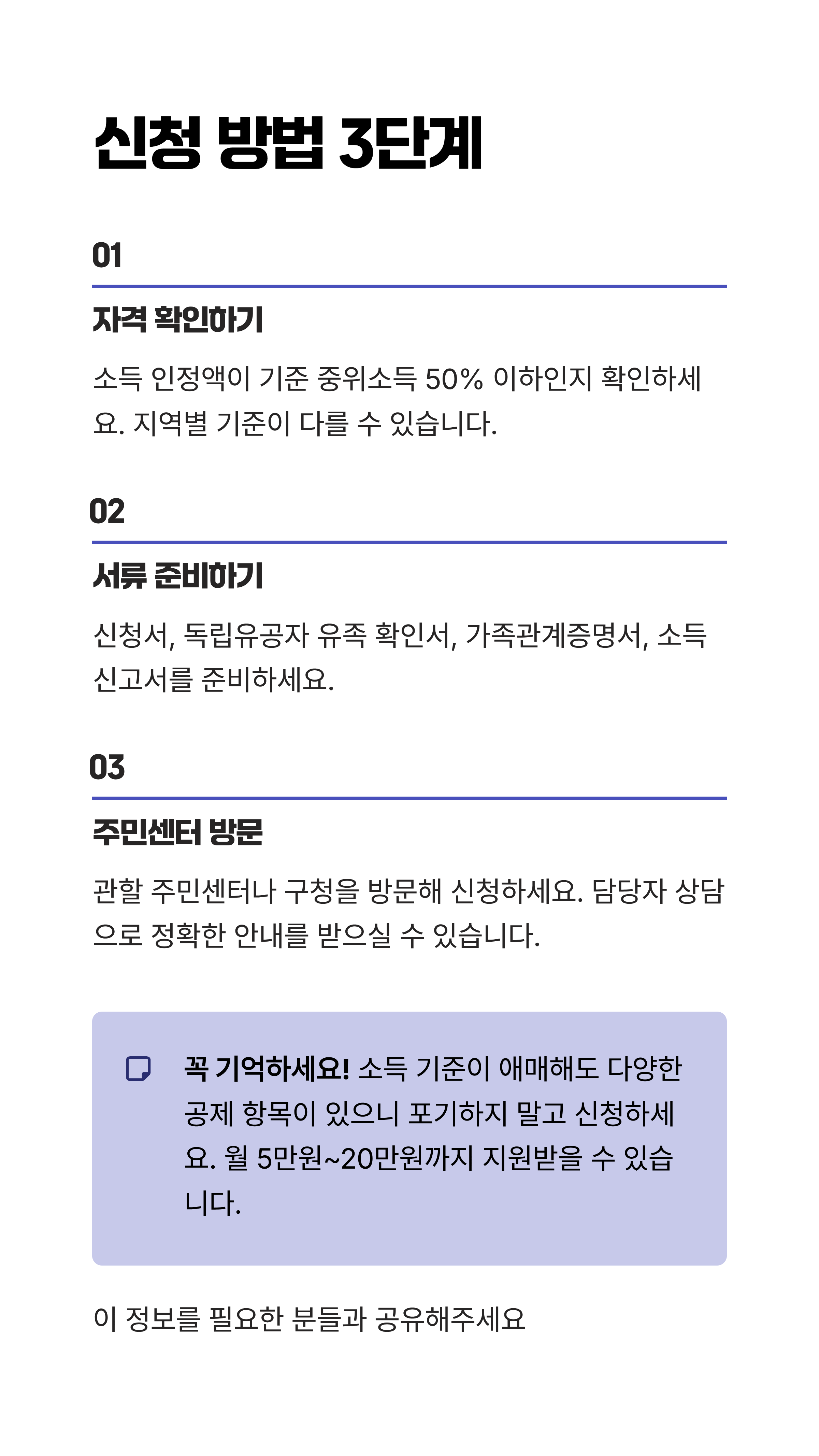 이처럼 소득 기준이 애매하더라도, 신청을 해보는 것이 가장 중요합니다. 생각보다 다양한 공제 항목이 적용되어 기준을 충족할 수도 있거든요! 지레 포기하지 마세요.