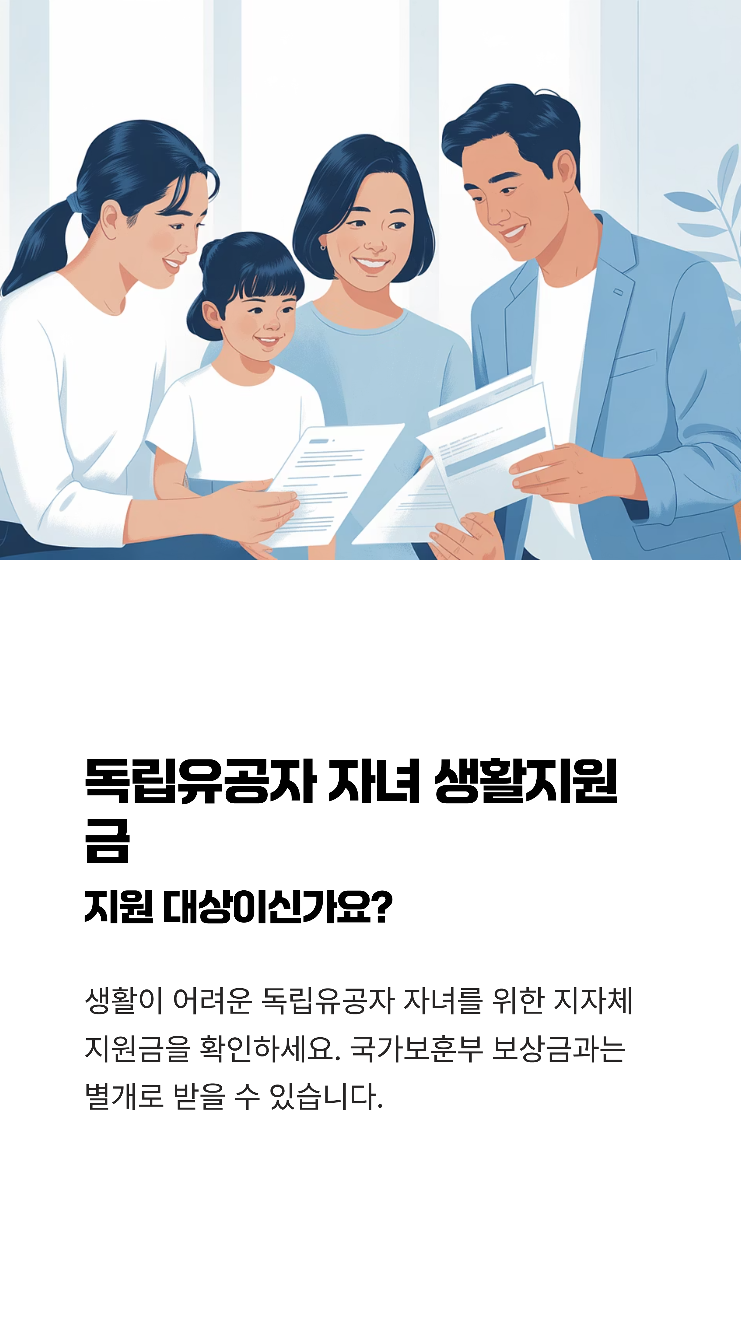 하지만 그 후손들이 경제적인 어려움을 겪고 있다면 너무나 안타까운 일이죠. 나라를 위해 헌신하신 분들의 가족에게 합당한 지원이 이루어지도록, 이 생활지원금은 꼭 받으셔야 합니다!