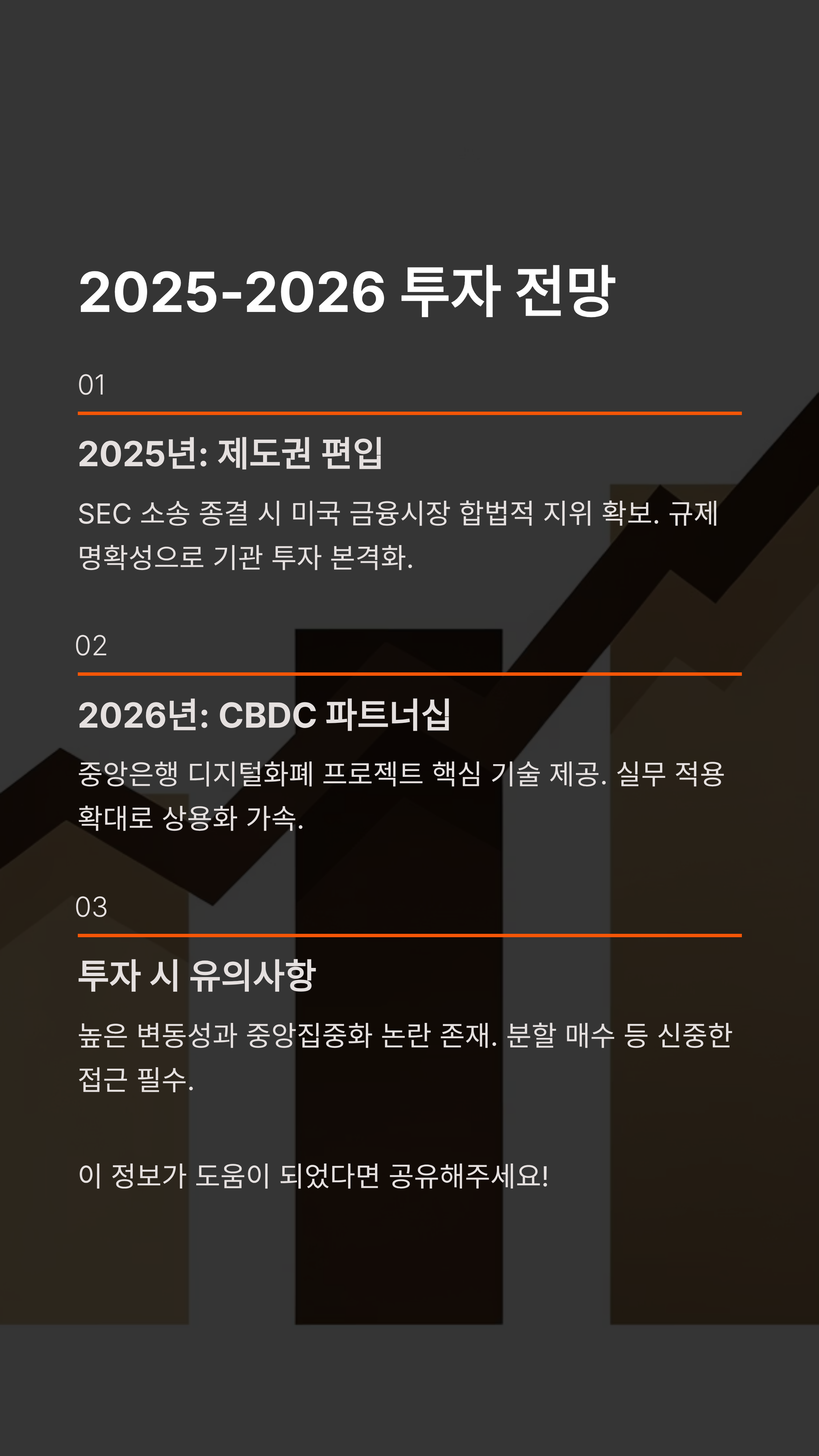 앞으로의 리플 전망은 어떨까요? 전문가들 사이에서도 의견이 분분하지만, 2025년은 리플의 '규제 명확성'이 완성되는 해가 될 것이라는 의견이 지배적입니다. SEC와의 소송이 완전히 종결되면 리플은 미국 내 금융 시장에서 합법적인 지위를 얻게 되거든요.