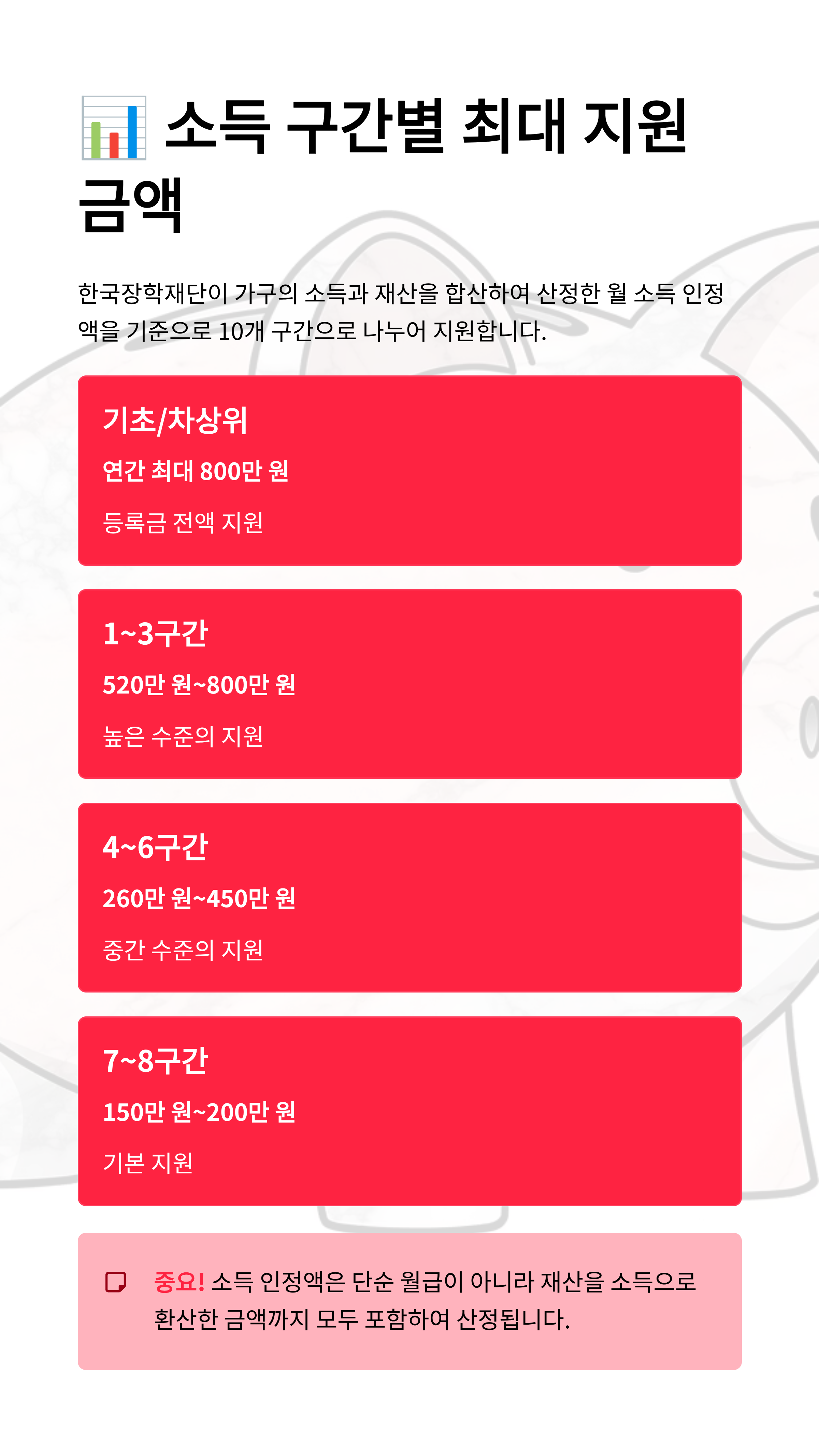 소득 구간은 한국장학재단이 학생과 그 가구원(부모 또는 배우자)의 소득과 재산(주택, 금융 자산, 자동차 등)을 합산해서 산정한 월 소득 인정액을 기준으로 나눈 10개 구간을 말합니다. 쉽게 말해, **'우리 가족의 경제적 형편이 10단계 중 어디에 속하는가'**를 나타내는 지표라고 생각하시면 돼요. 전문 용어는 어렵지만, 독자님이 쉽게 이해하실 수 있도록 풀어서 설명해 드릴게요.