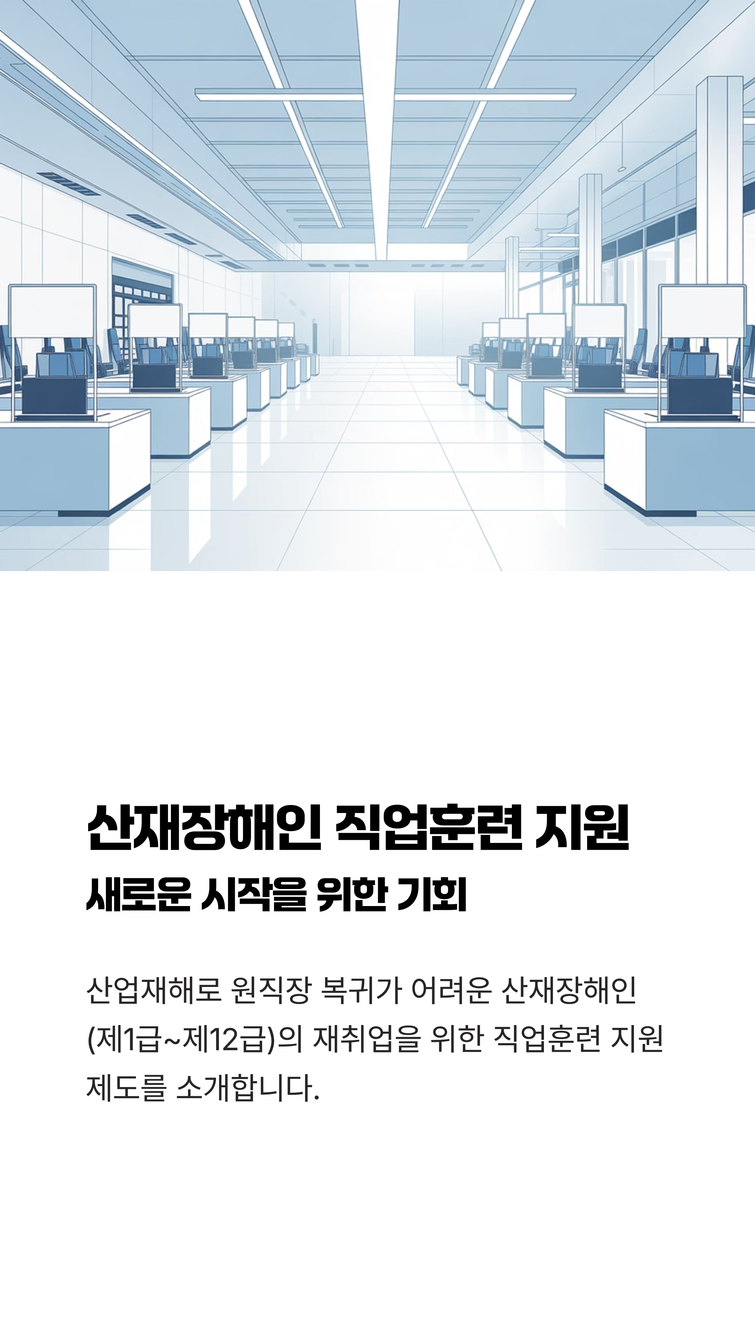여기서 한 가지 더, 요양 중인 분들도 희망을 잃지 마세요! 업무상 재해로 요양 중이라도, 치유 후 장해등급(제1급~제12급)에 해당할 것이라는 의학적 소견이 있다면 요양 종결 전에도 직업훈련 지원이 가능하거든요.