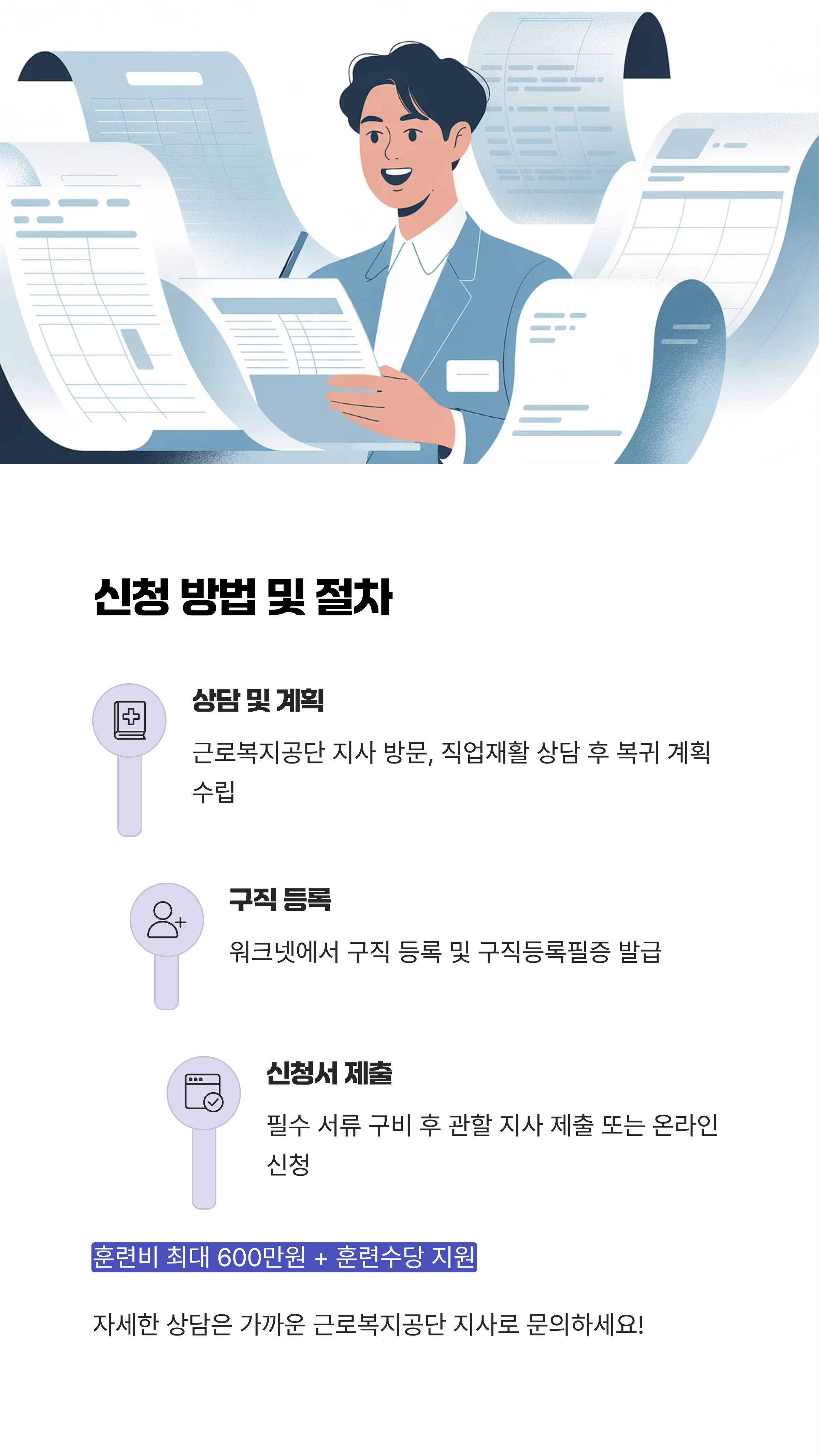 - 네 번째 핵심 포인트. 신청은 근로복지공단 지사 방문 또는 토탈서비스를 이용하며, 사전 구직 등록과 직업 복귀 계획 수립이 필수입니다.