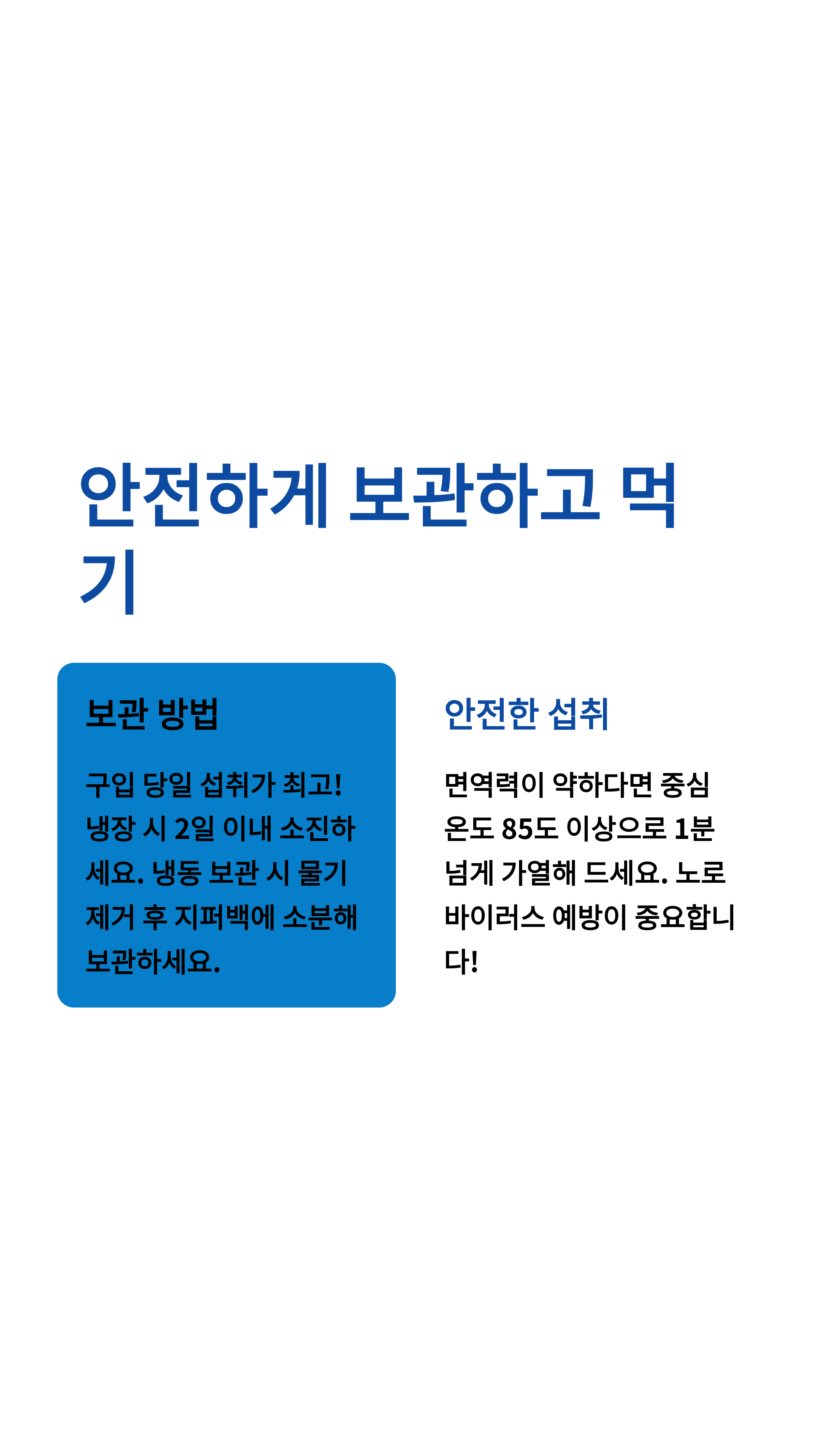 - 안전: 노로바이러스 예방을 위해 가급적 85도 이상 가열 섭취.