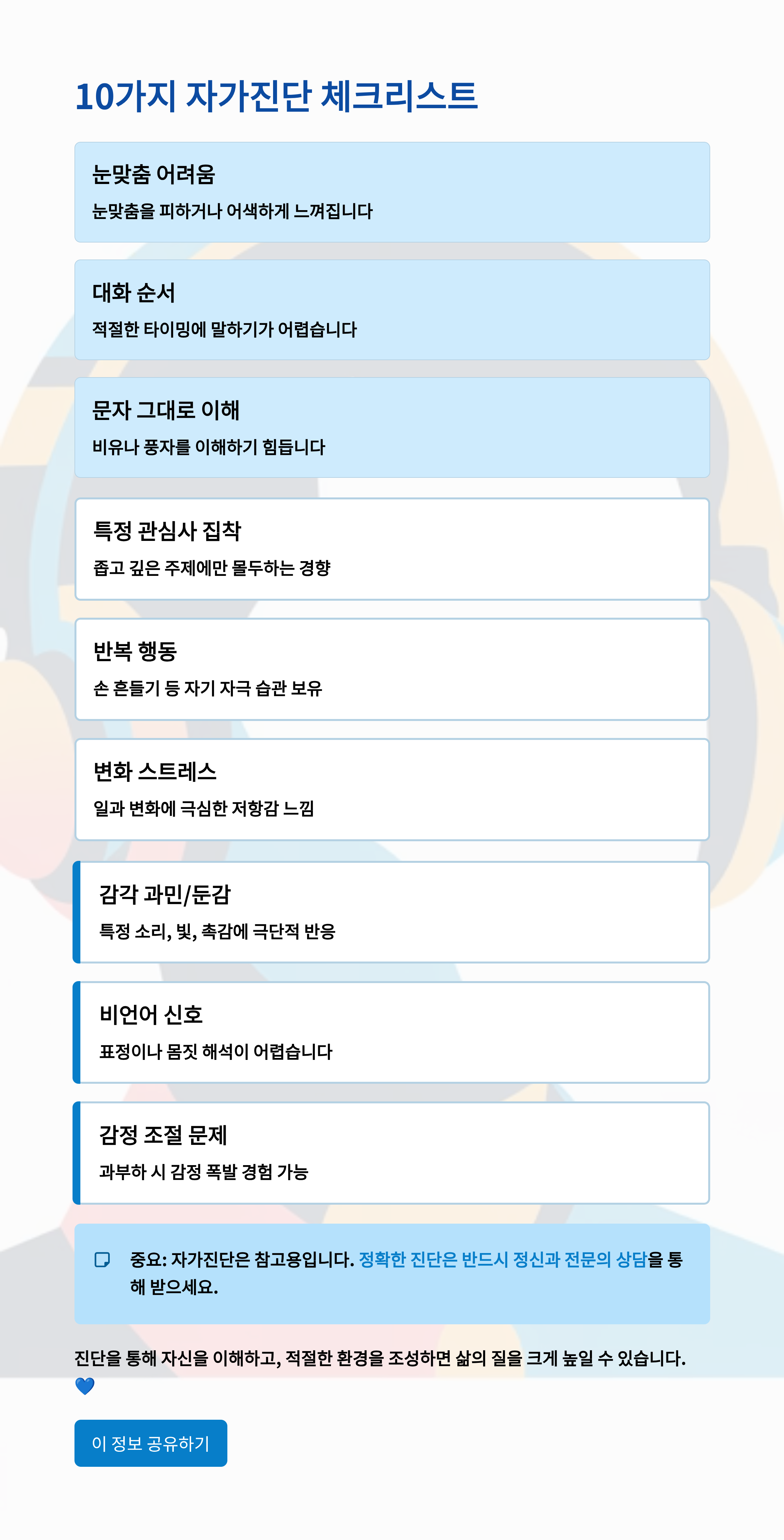 **자가진단은 정확한 진단이 될 수 없어요.** 자폐 스펙트럼의 특징은 불안장애, 사회 공포증 등 다른 정신 건강 문제와 겹쳐서 오해될 수 있거든요. 단순히 '성격이 이상하다'고 치부하지 마시고, 삶의 질에 영향을 미칠 정도라면 꼭 **전문가와 상의**하는 것이 중요해요.