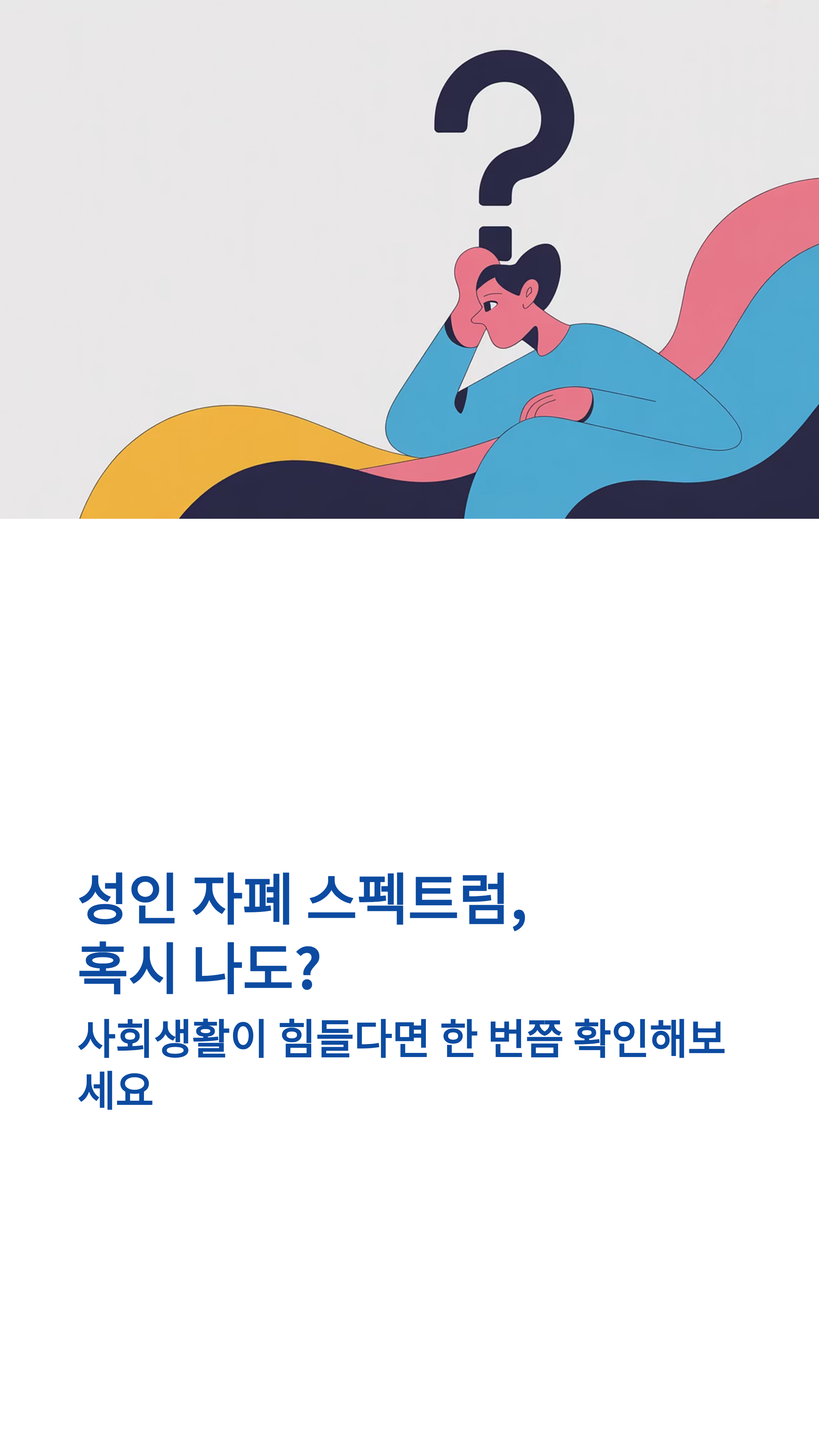 안녕하세요, 여러분! 최근 들어 '자폐 스펙트럼 장애(ASD)'라는 단어를 예전보다 더 자주 접하게 되는 것 같아요. 특히 성인이 되어서야 자신의 특성을 깨닫고 자가진단을 해보려는 분들이 많아지고 있거든요. 혹시 여러분도 "나도 혹시...?"라는 생각을 해본 적이 있으신가요?