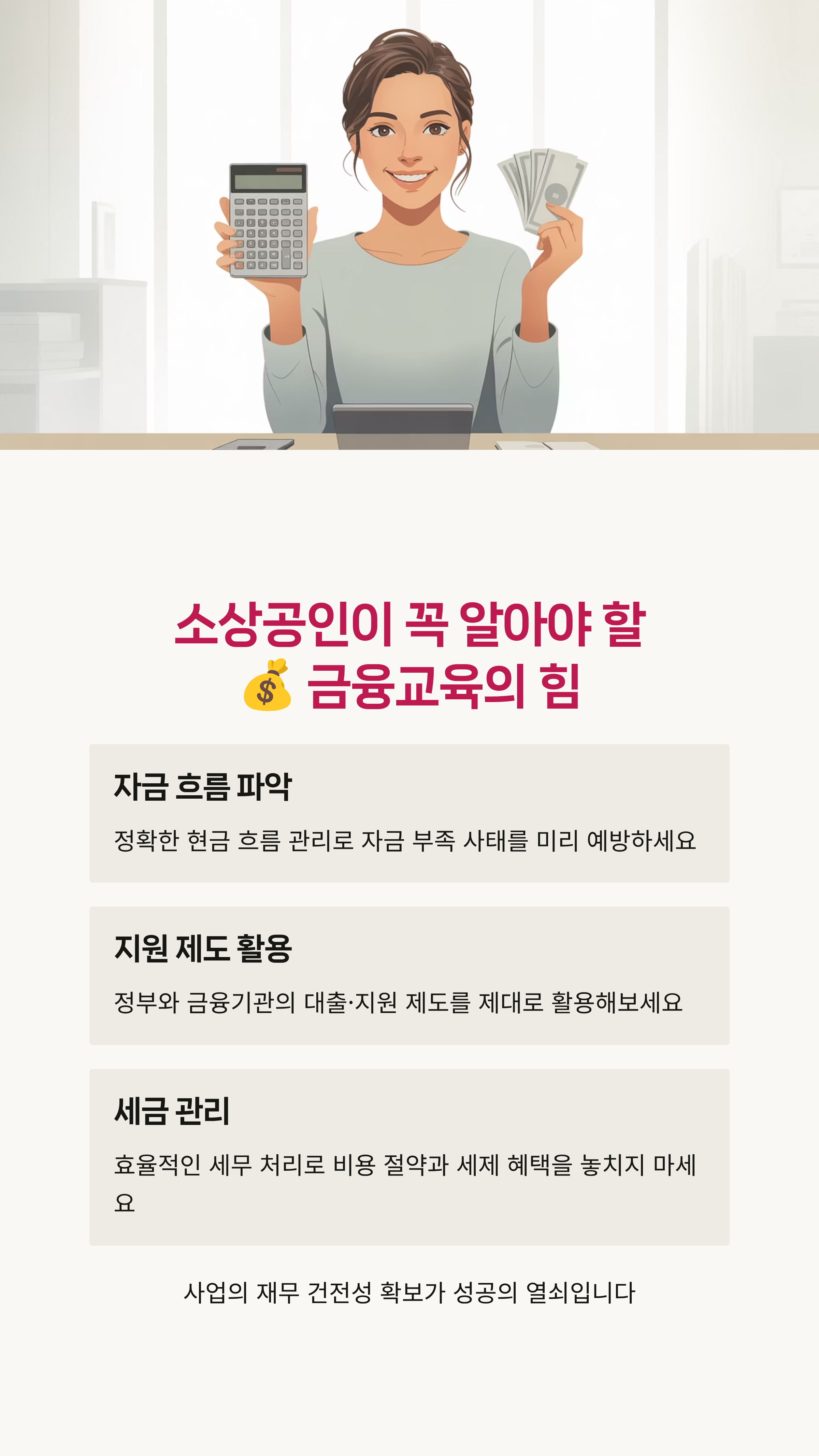 - 왜 중요한가: 금융교육은 사업의 자금 관리, 대출 활용, 세금 효율성을 높여 사업의 안정성과 성장을 돕습니다.