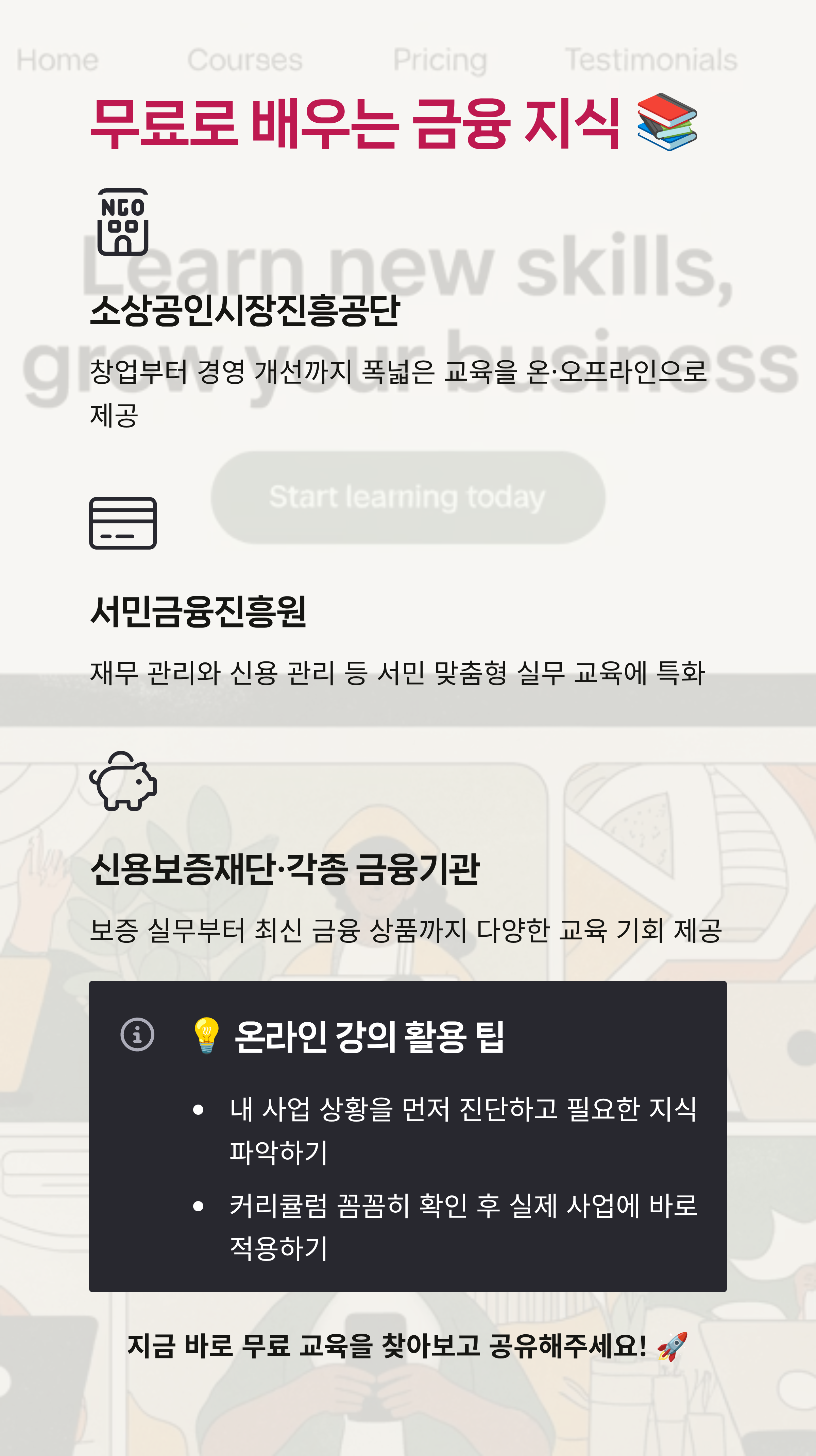 - 어디서 배우나: 소상공인시장진흥공단, 서민금융진흥원 등 다양한 정부 및 공공기관에서 무료 강의를 제공합니다.