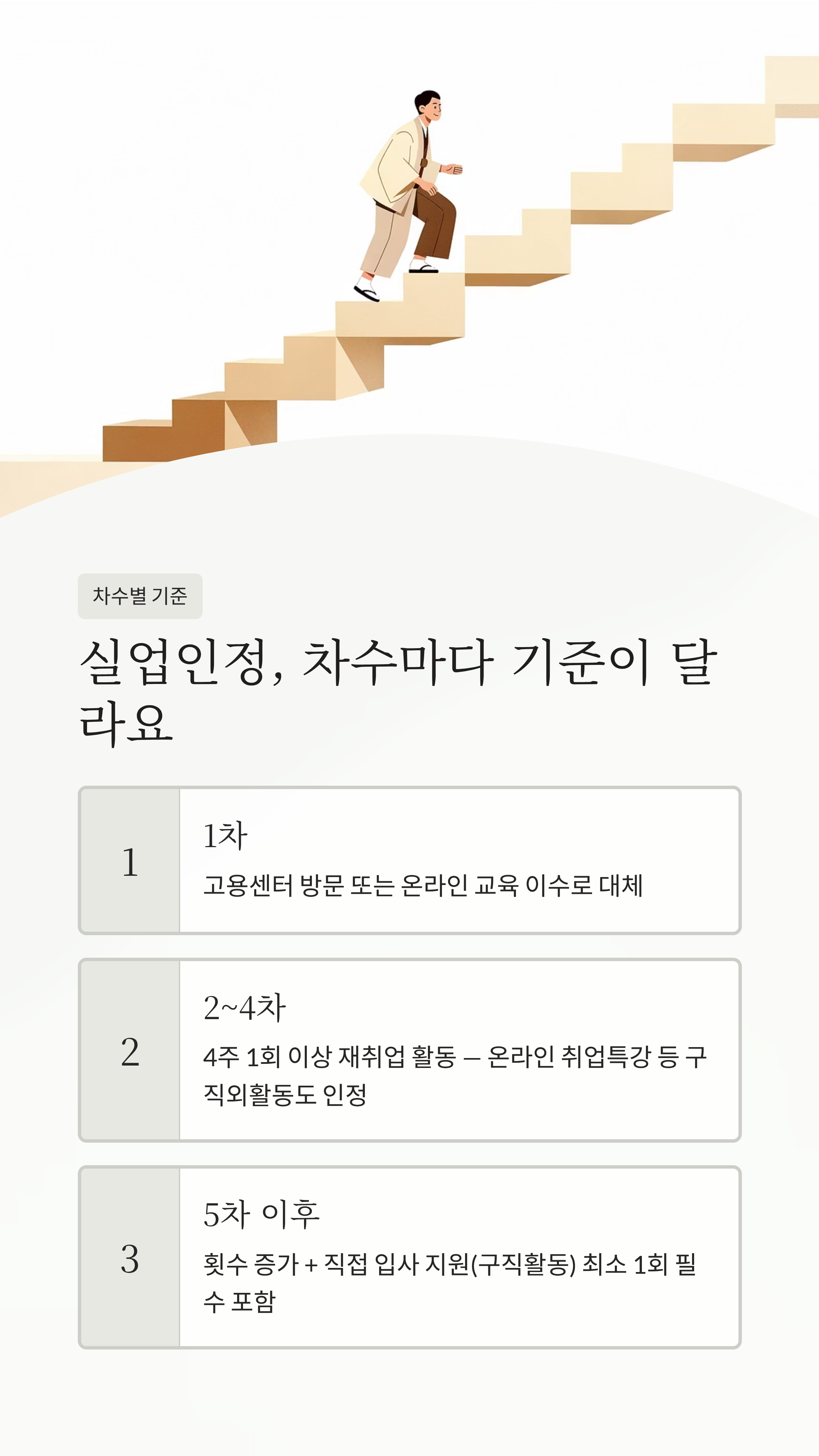 - 차수별 기준 확인. 1~4차는 4주 1회, 5차부터는 4주 2회(구직활동 1회 필수)입니다.