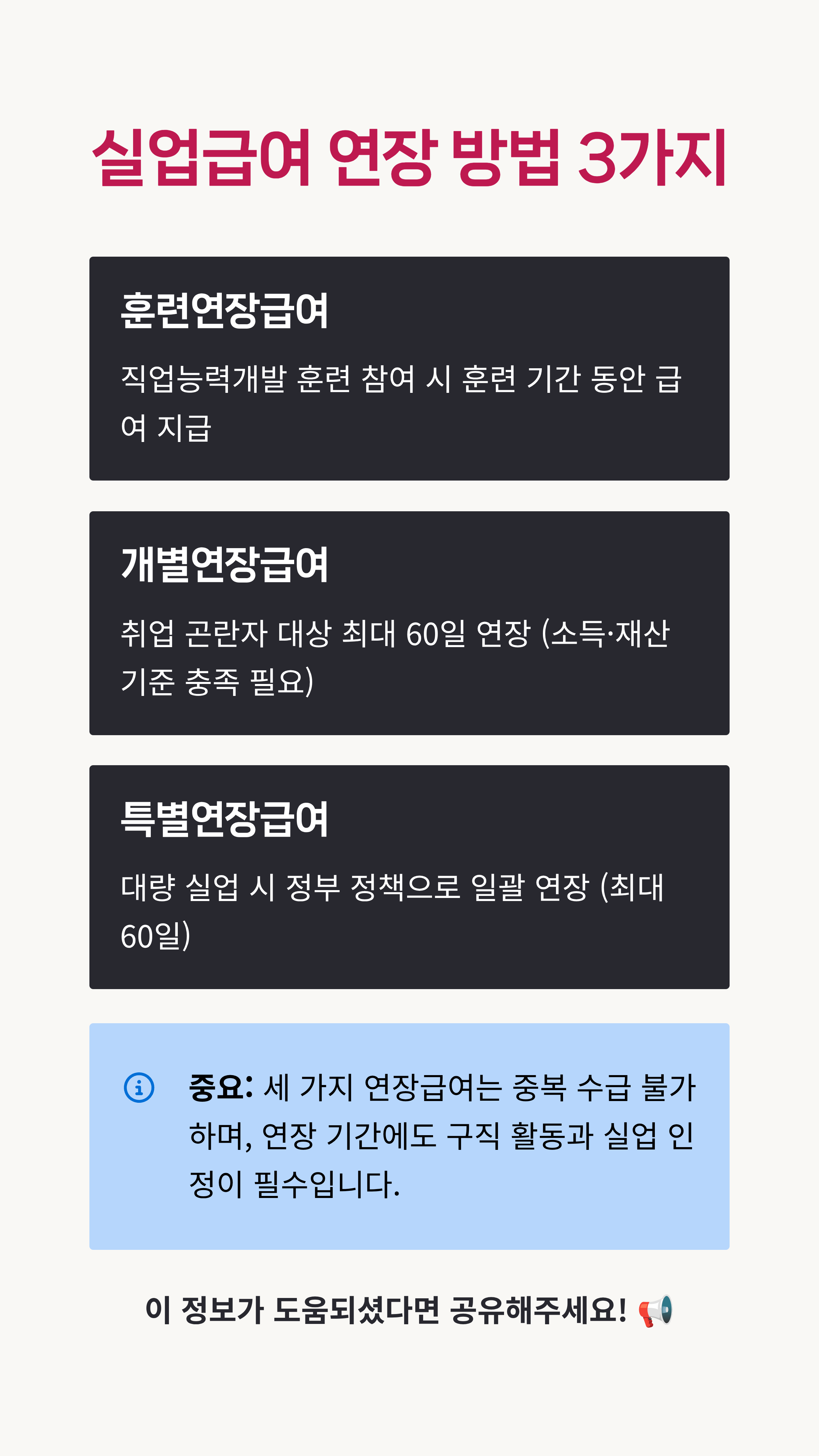 | 특별연장급여 | 60일 한도 | 실업률 급증 등 비상 상황 | 정부 정책으로 일괄 적용 |