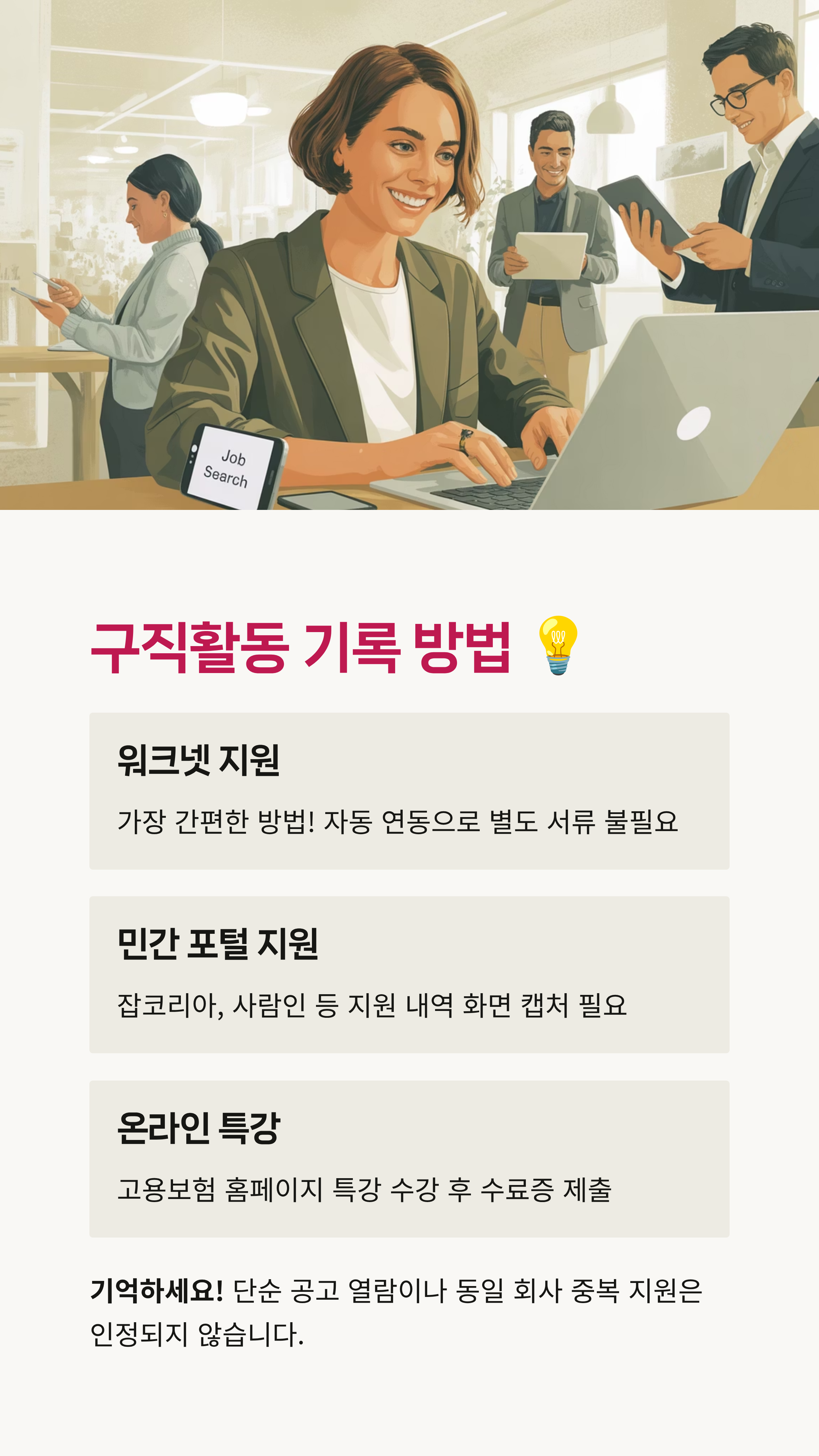 구직활동은 단순히 이력서를 제출하는 것뿐만 아니라, 직업 훈련 참여, 채용 박람회 참가, 온라인 취업 특강 수강 등 다양한 방법으로 인정받을 수 있어요. 본인의 상황에 맞는 활동을 선택해서 효율적으로 시간을 관리하는 것이 현명한 방법이에요.