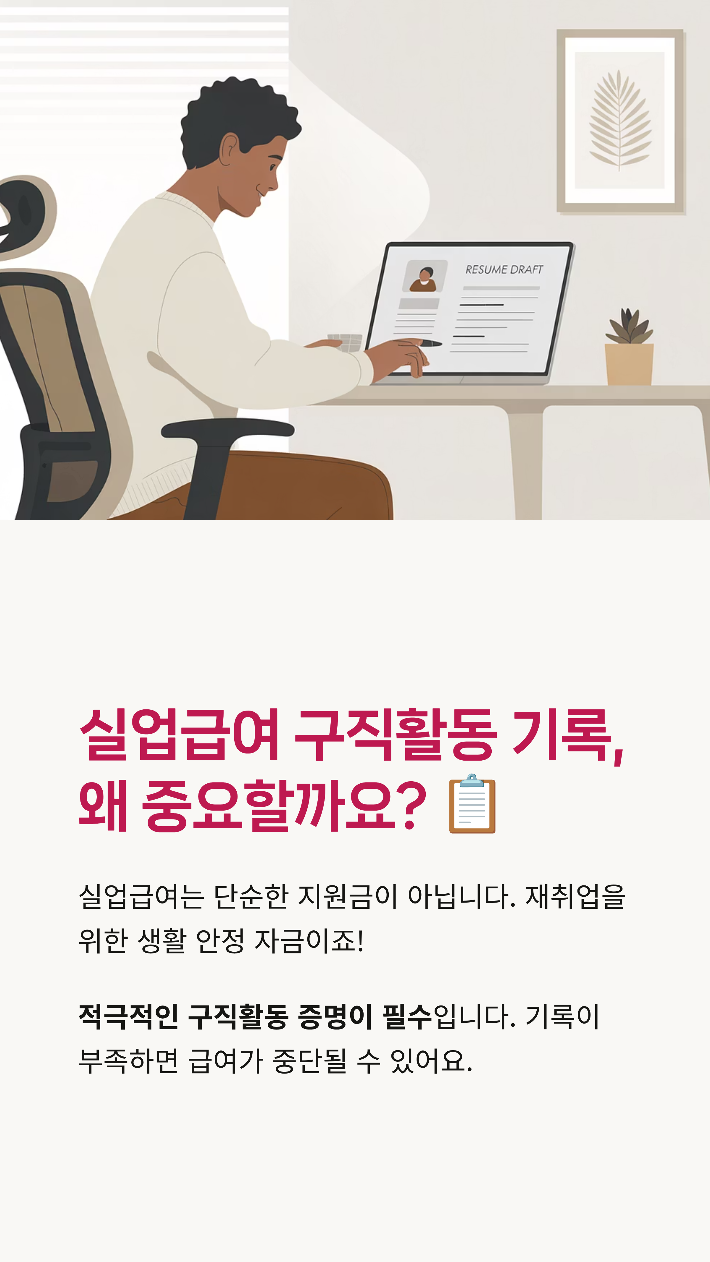 실업급여는 말 그대로 '실업' 상태에서 '구직'을 하는 동안 생활을 안정시키기 위한 급여예요. 그래서 급여를 받는 동안 계속해서 적극적인 구직활동을 하고 있다는 걸 증명해야 하죠. 이 증명 과정이 바로 우리가 흔히 말하는 '구직활동 기록'이에요. 고용센터는 이 기록을 보고 여러분이 정말로 취업 의지가 있는지 확인하거든요.