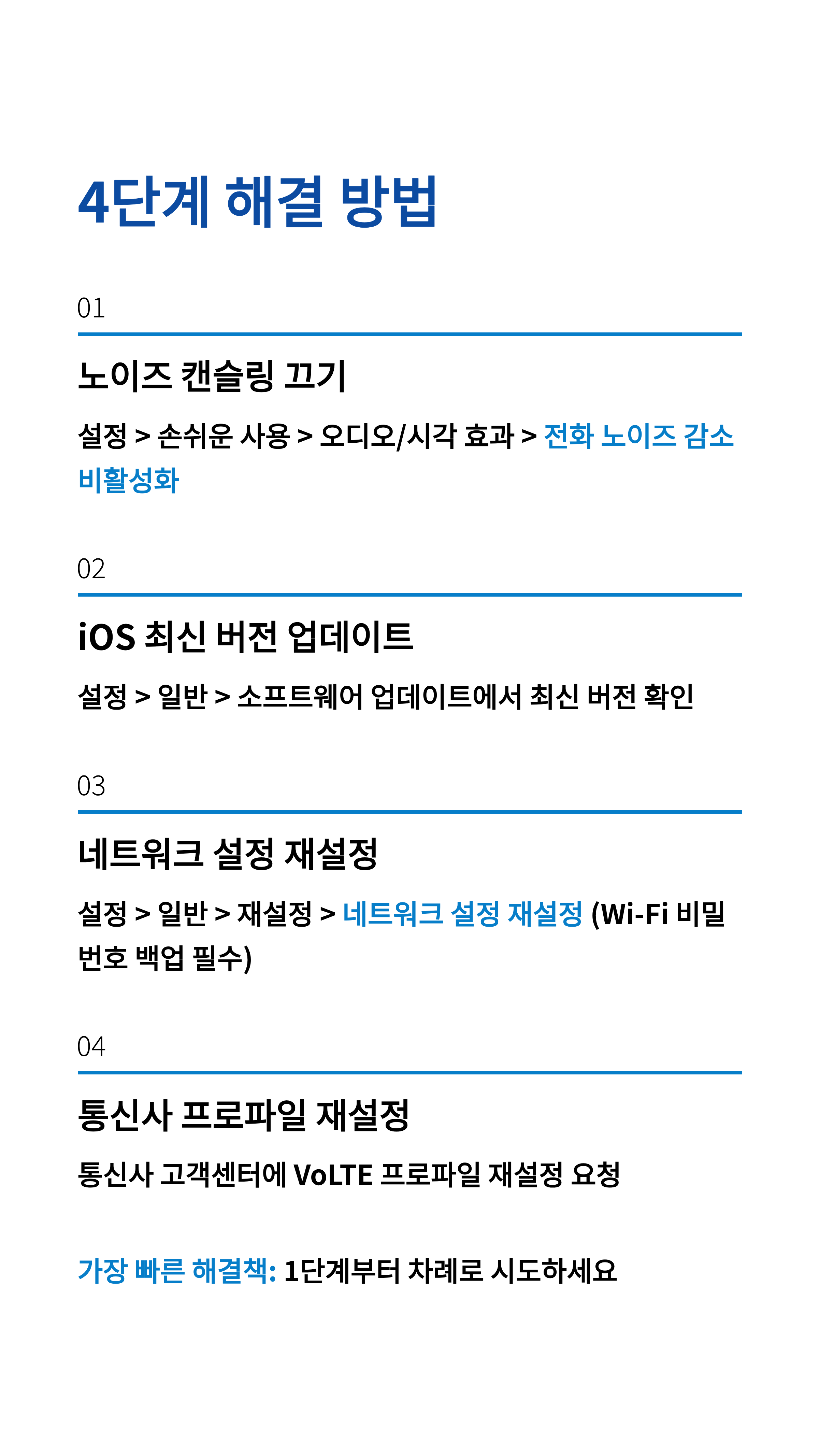 | VoLTE 설정 변경 | VoLTE 사용 설정을 껐다가 다시 켜기 | 설정 > 셀룰러 > 셀룰러 데이터 옵션 > 음성 및 데이터 > **VoLTE 끄기/켜기** | 통신 환경 재설정 |
