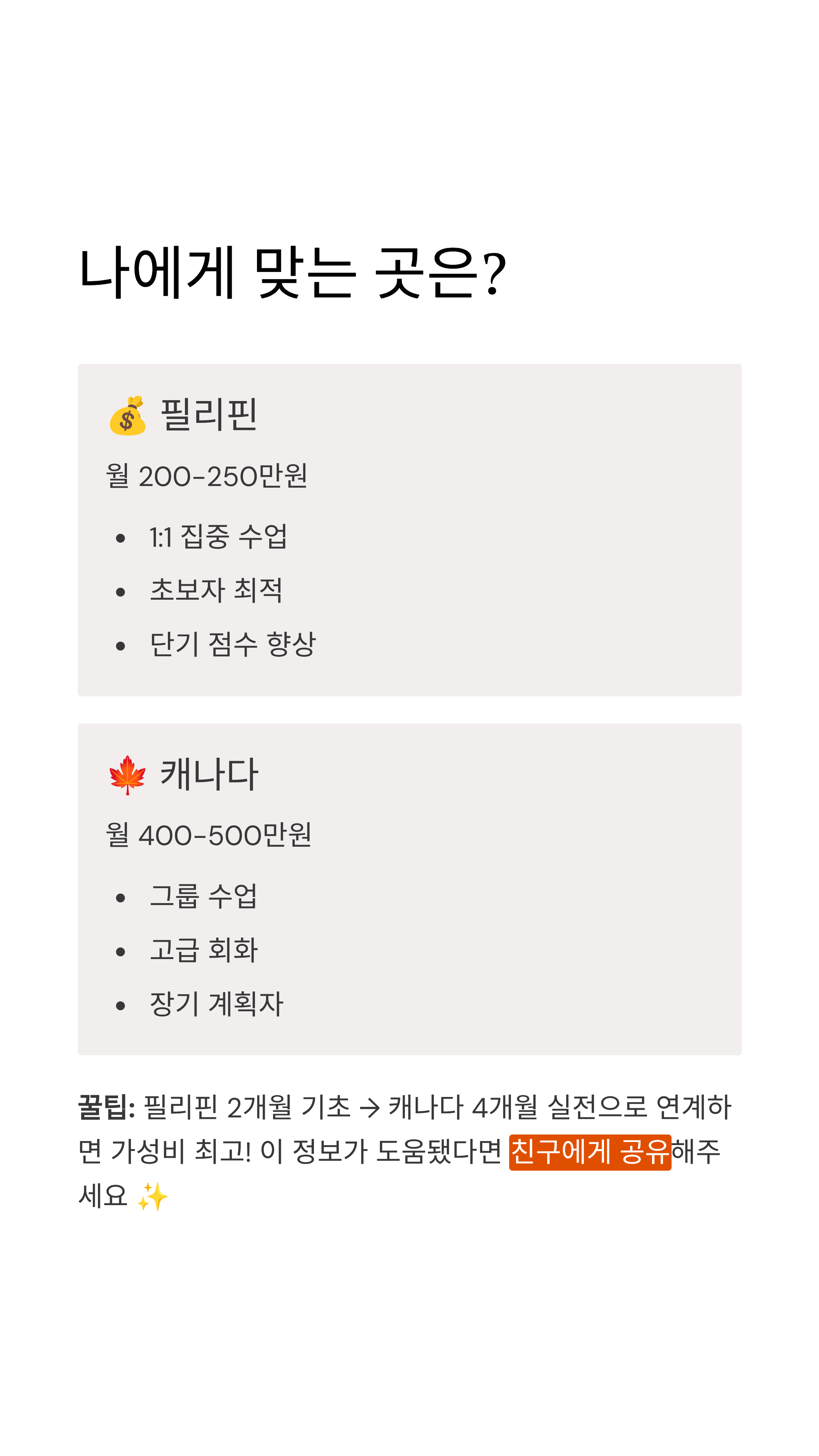 - 연계 연수라는 전략적 선택! 필리핀(기초) + 캐나다(심화) 조합이 가장 효율적일 수 있습니다.