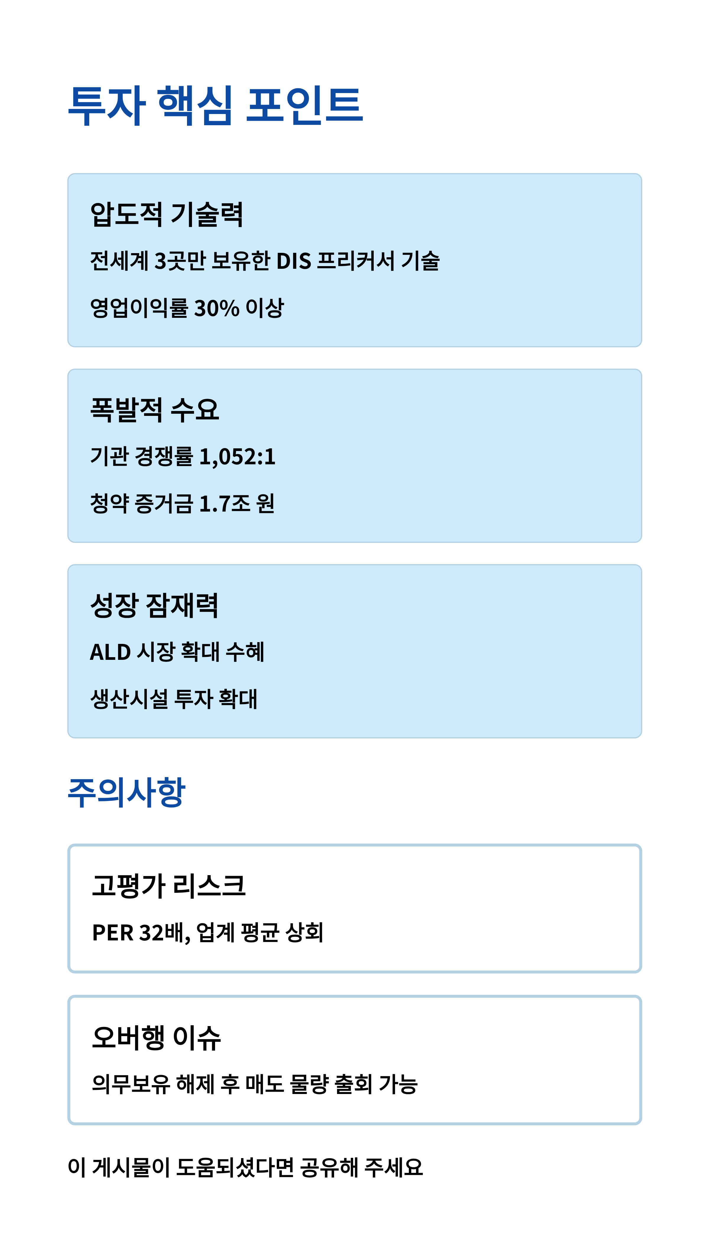 - 다섯 번째 핵심 포인트: 리스크 관리. 상장 초기 고평가(PER 32배) 및 향후 의무보유확약 해제에 따른 오버행 이슈를 염두에 두고 투자해야 합니다.