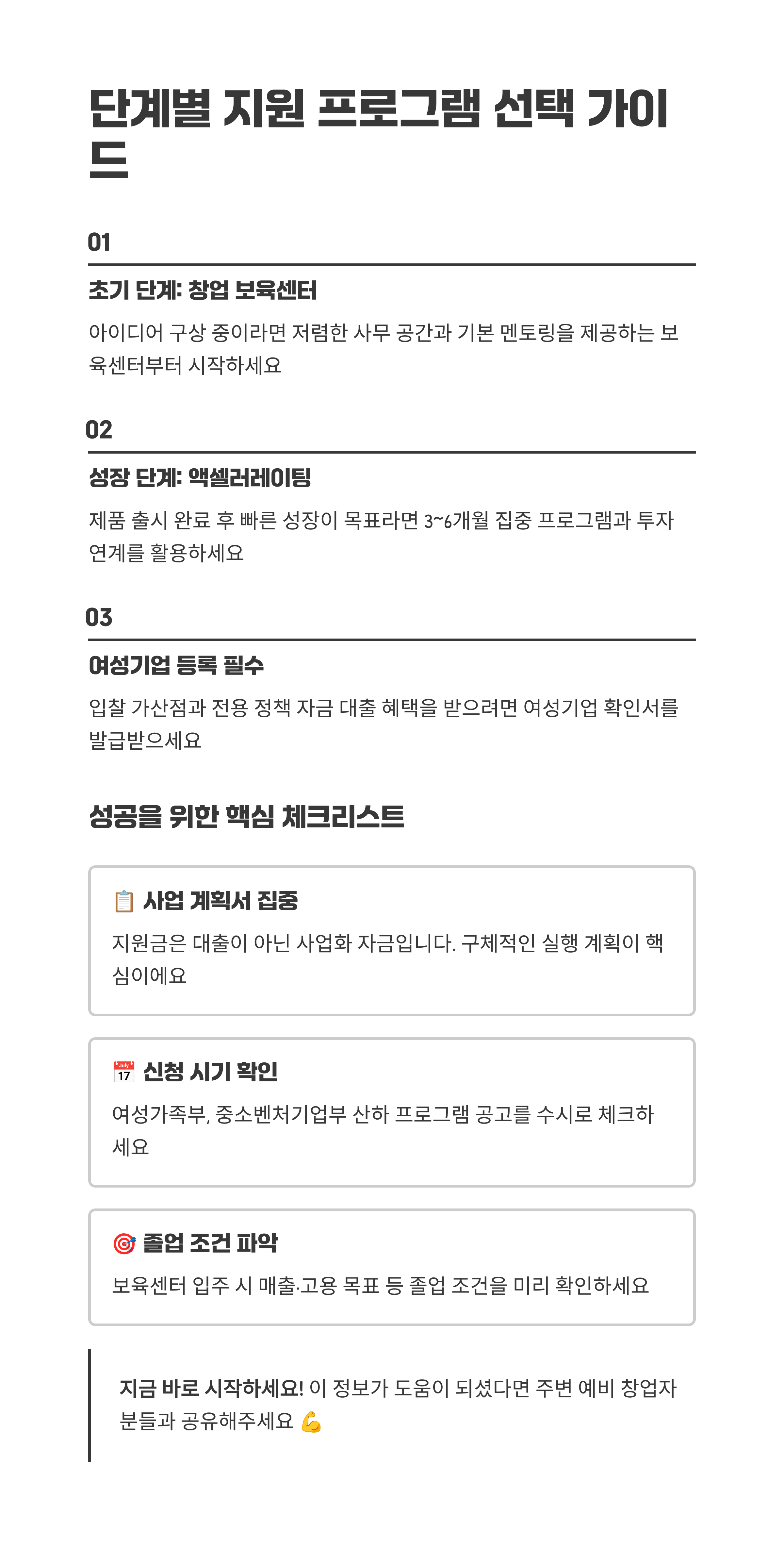 지금까지 여성 창업자를 위한 지원금 및 프로그램에 대해 자세히 알아봤어요. 핵심은 '단계별 맞춤 전략'과 '여성 특화 프로그램 활용'이라는 점을 다시 한번 강조하고 싶어요.