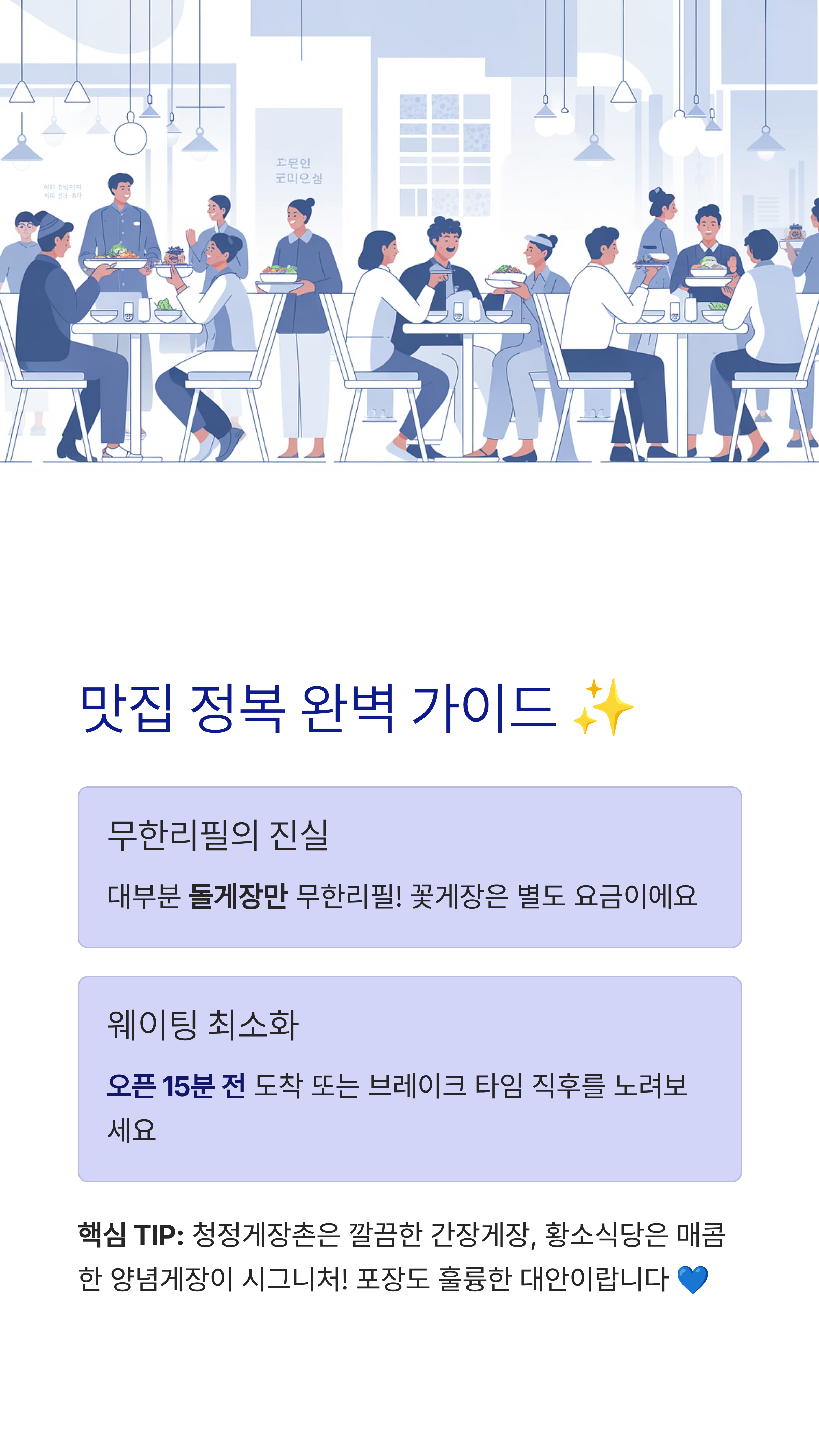 - 두 번째 핵심 포인트. **청정게장촌**은 깔끔한 간장게장과 푸짐한 구성으로, **황소식당**은 매콤한 양념게장으로 유명합니다.