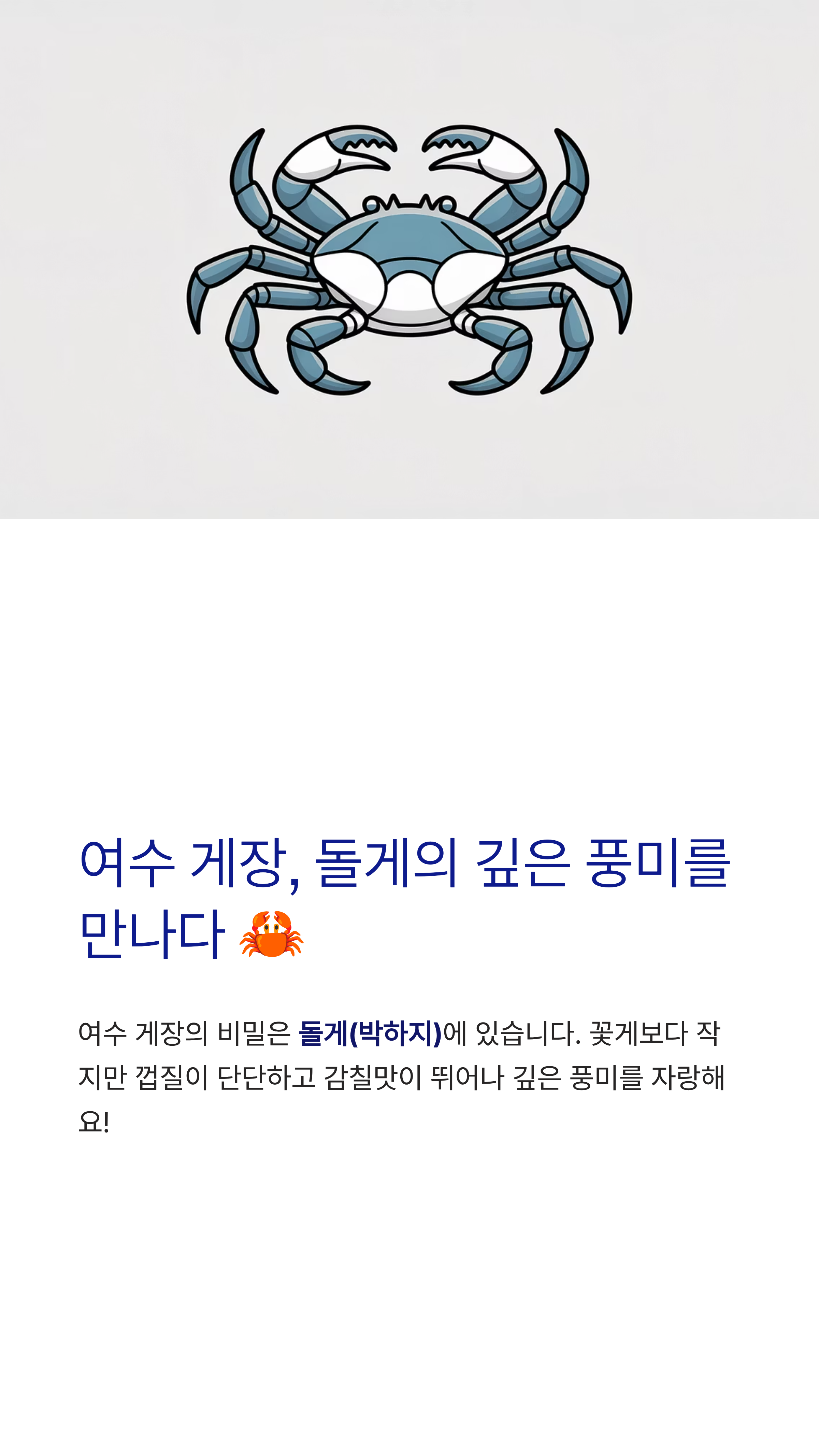 추가 설명이 필요하다면 이어서 작성합니다. 돌게장의 단단한 껍질 때문에 먹기 힘들다고 생각할 수도 있지만, 여수 맛집들은 보통 게를 먹기 좋게 손질해서 제공한답니다. 전문 용어인 '돌게'나 '박하지'는 이렇게 쉽게 풀어 설명하는 것이 좋겠죠?