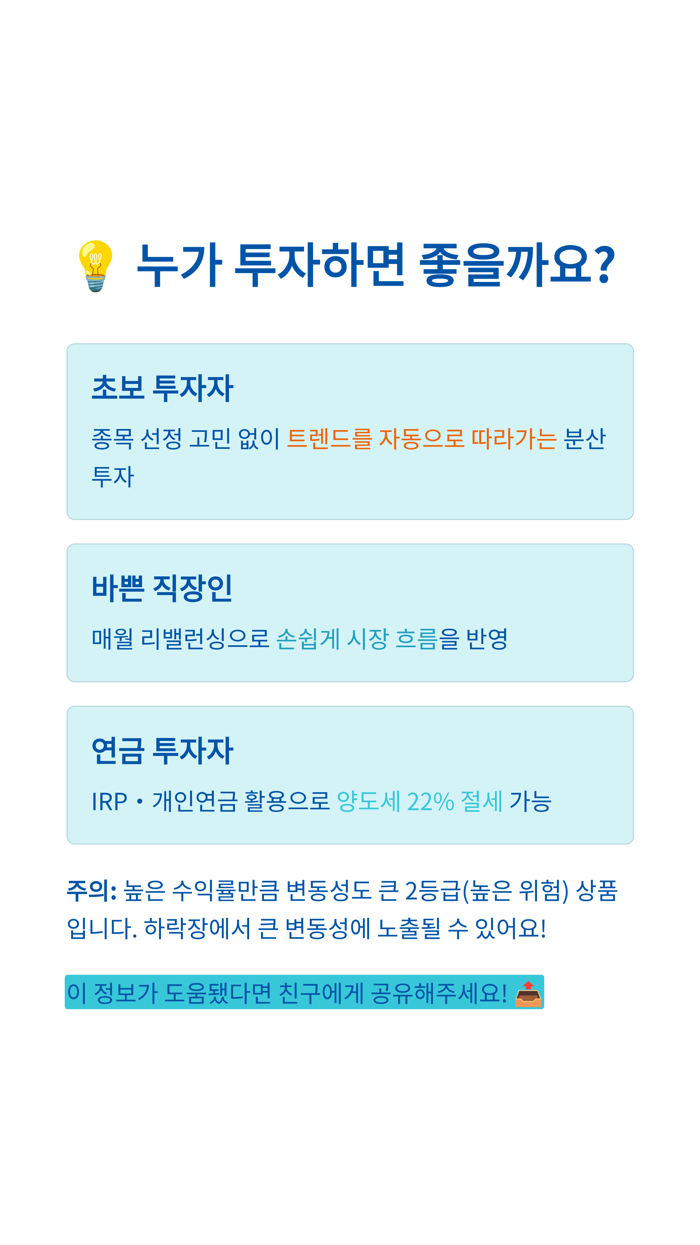 - 연금 계좌(IRP/개인연금) 투자가 가능하여 **세제 혜택**까지 동시에 누릴 수 있는 장점이 있습니다.