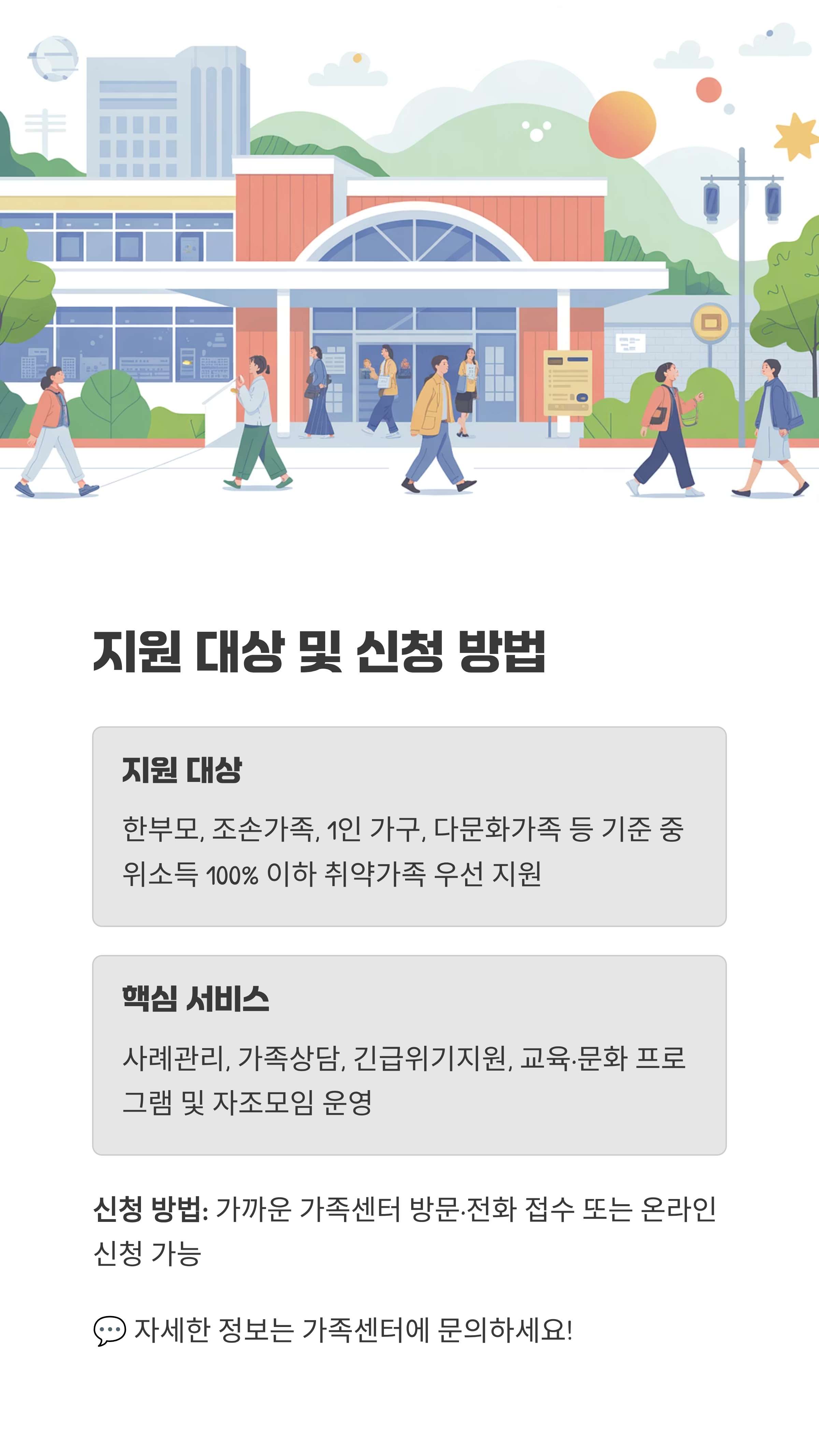 | 취약가족 | 한부모가족, 조손가족, 노부모 부양가족, 청소년(한)부모, 1인 가구, 다문화가족, 이혼 위기 가족 등 | 중위소득 100% 이하 우선 지원 (지자체별 조정 가능) |