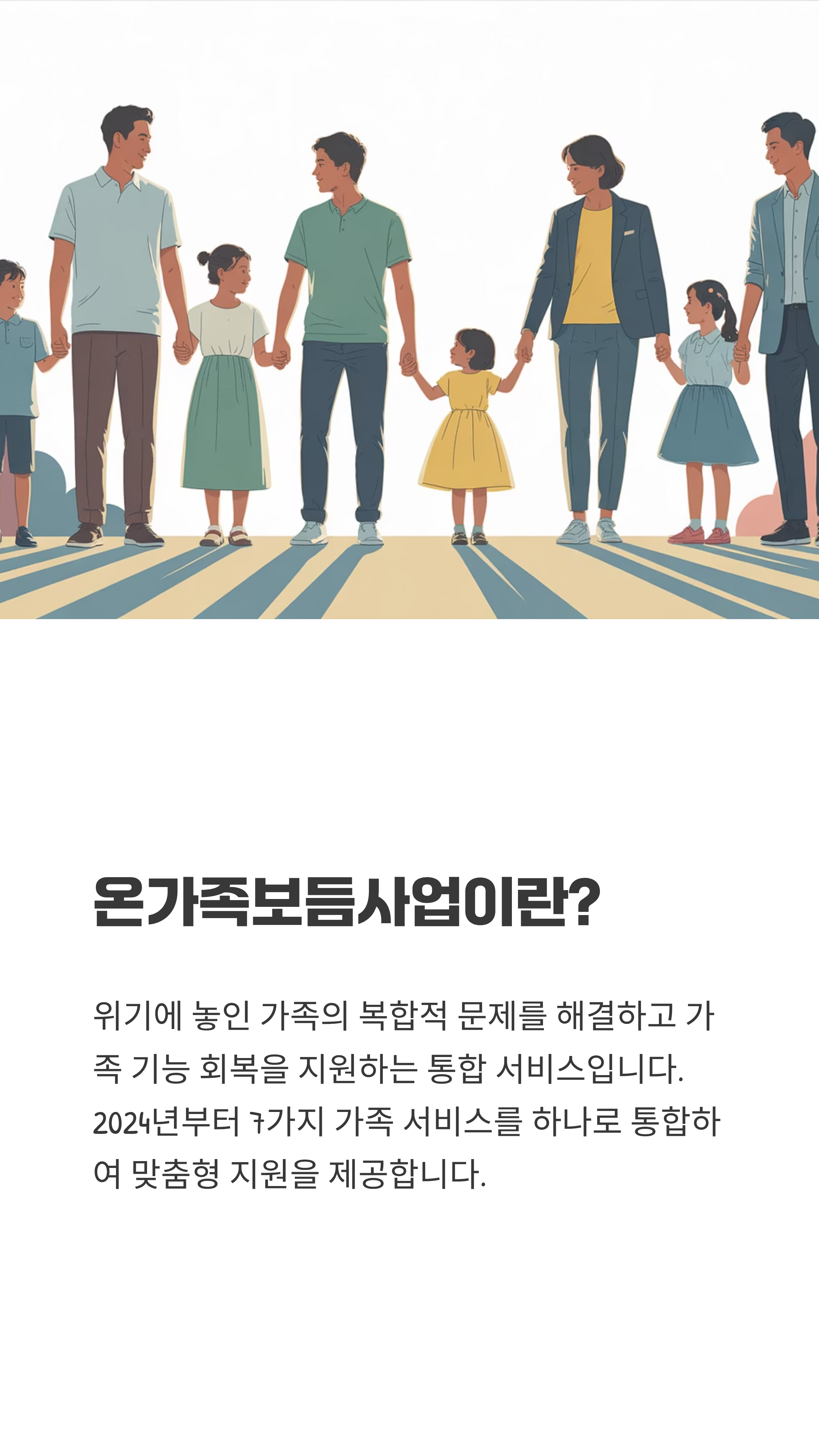 온가족보듬사업은 2024년부터 기존에 개별적으로 운영되던 7가지 가족 서비스를 하나로 통합한 것이 가장 큰 특징이에요. 예전에는 가족 형태별로(예: 다문화가족, 1인 가구 등) 따로따로 서비스를 신청해야 했다면, 이제는 온가족보듬사업을 통해 가족 누구에게나 맞춤형 서비스를 통합적으로 지원받을 수 있게 되었죠.