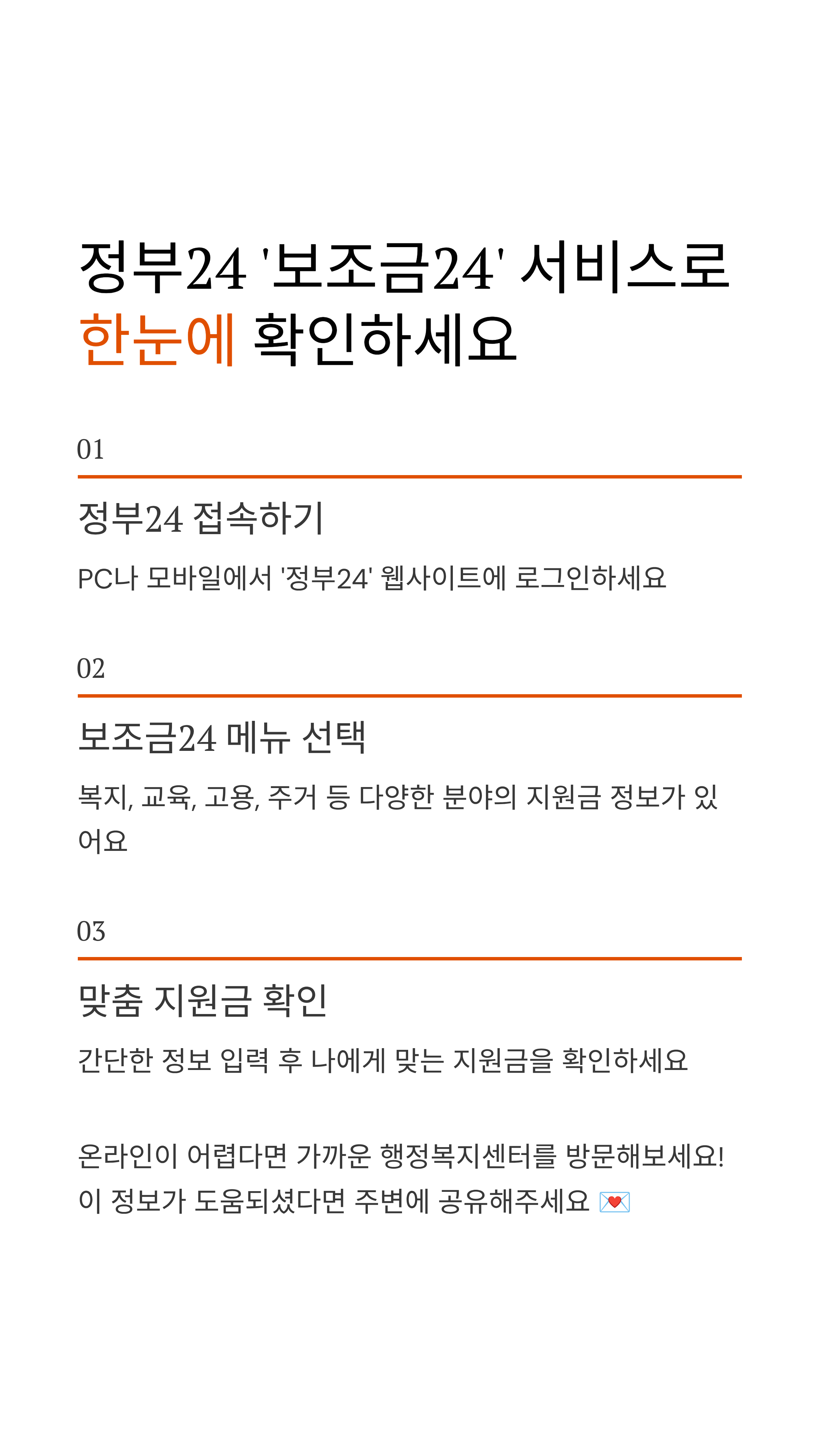 - 정부24 보조금24를 먼저 확인하세요. 가장 확실하고 개인 맞춤형 정보를 얻을 수 있는 첫걸음입니다.