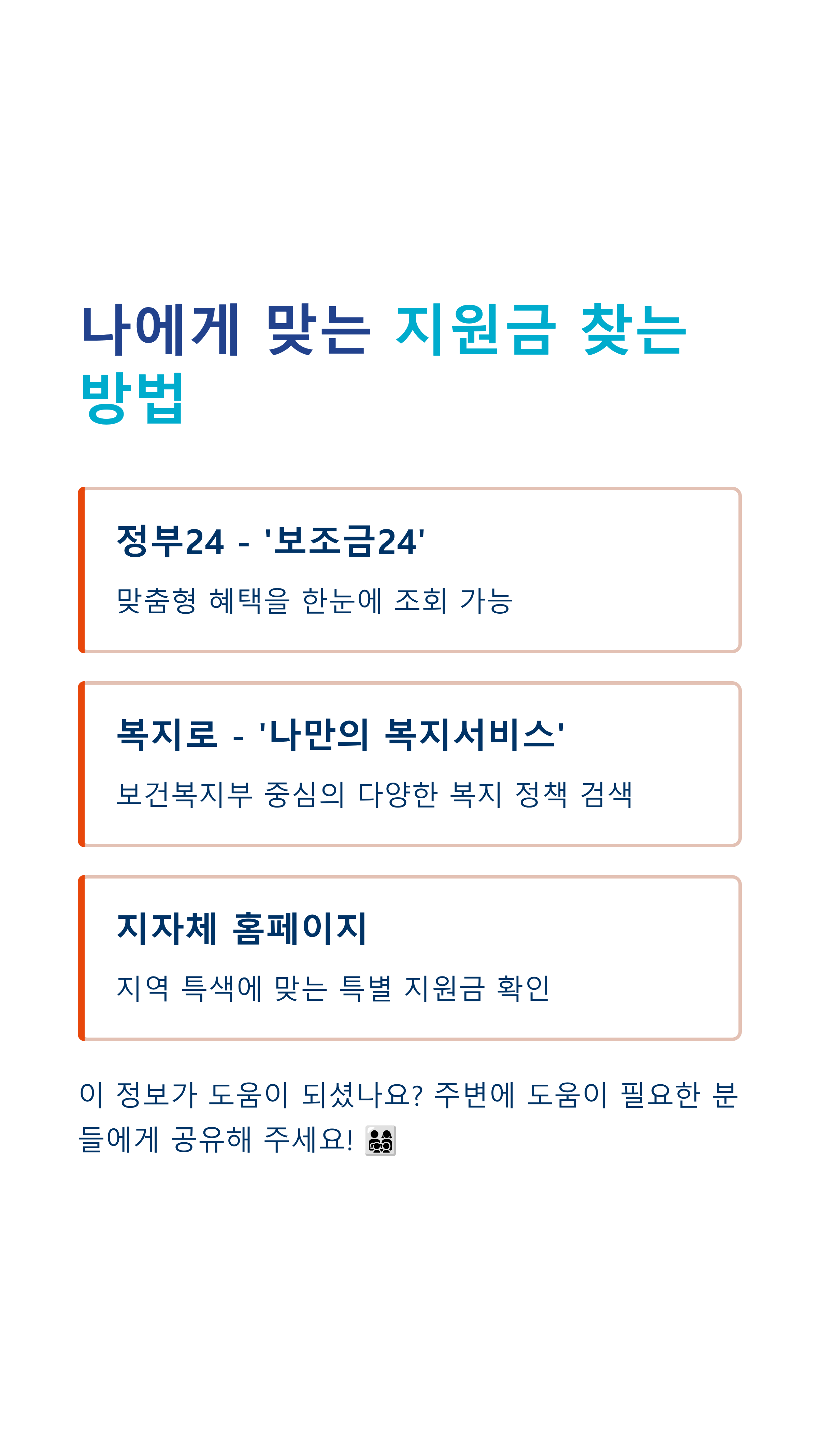 어때요? 이제 정부 지원금 찾는 것이 조금은 쉬워 보이죠? 혼자 고민하지 마시고, 오늘 알려드린 방법으로 꼭 숨어있는 나의 혜택을 찾아내시길 바랄게요! 혹시 더 궁금한 점이 있다면 언제든지 댓글로 남겨주세요~ 😊