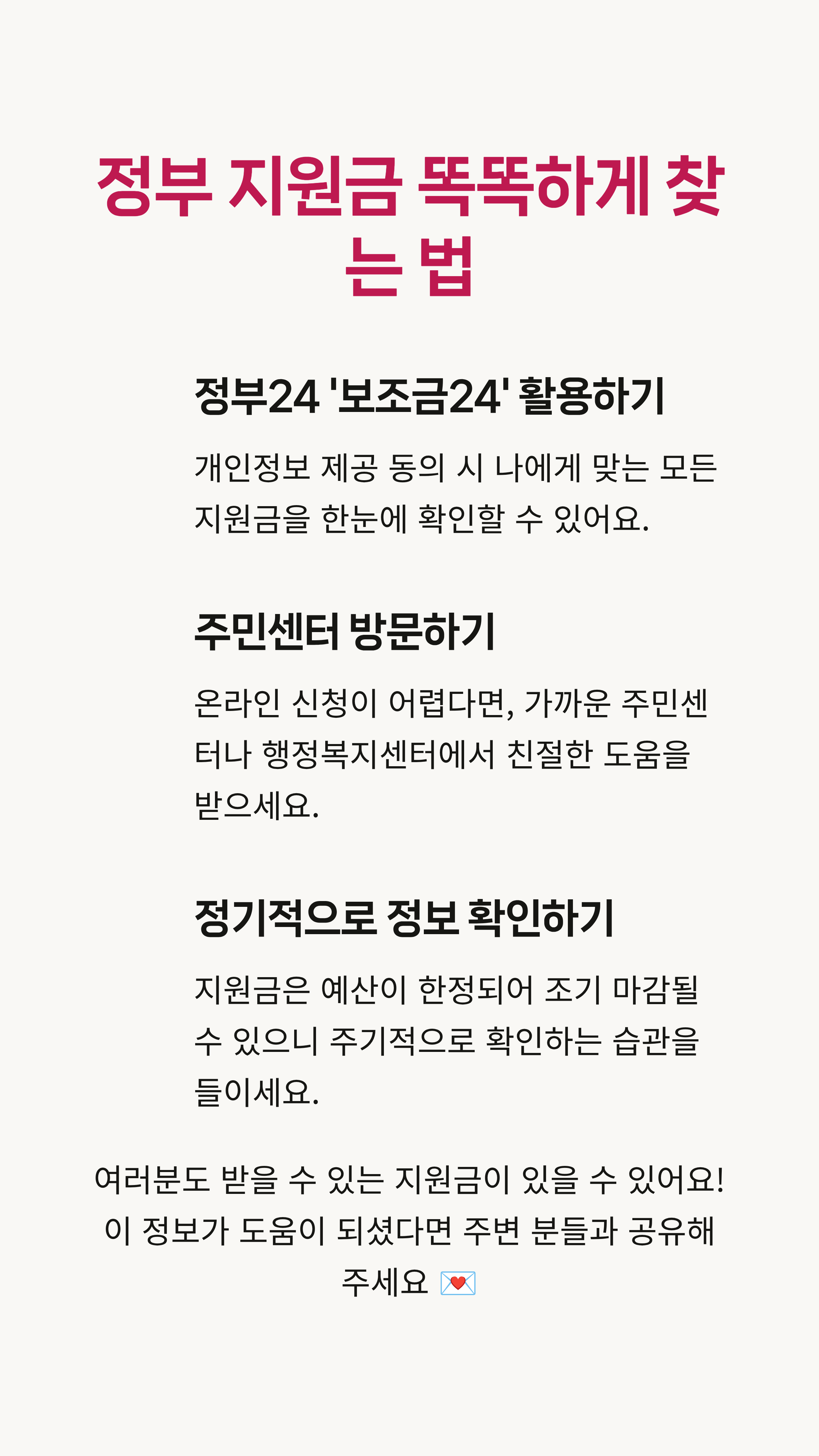 이 글이 여러분의 숨은 지원금을 찾는 데 작은 도움이 되었으면 좋겠어요. '에이, 설마 내가 되겠어?'라고 생각하지 말고, 꼭 한번 확인해보세요. 생각보다 큰 혜택이 여러분을 기다리고 있을지 몰라요! 혹시 더 궁금한 점이 있다면 언제든지 댓글로 물어봐 주세요~ 😊