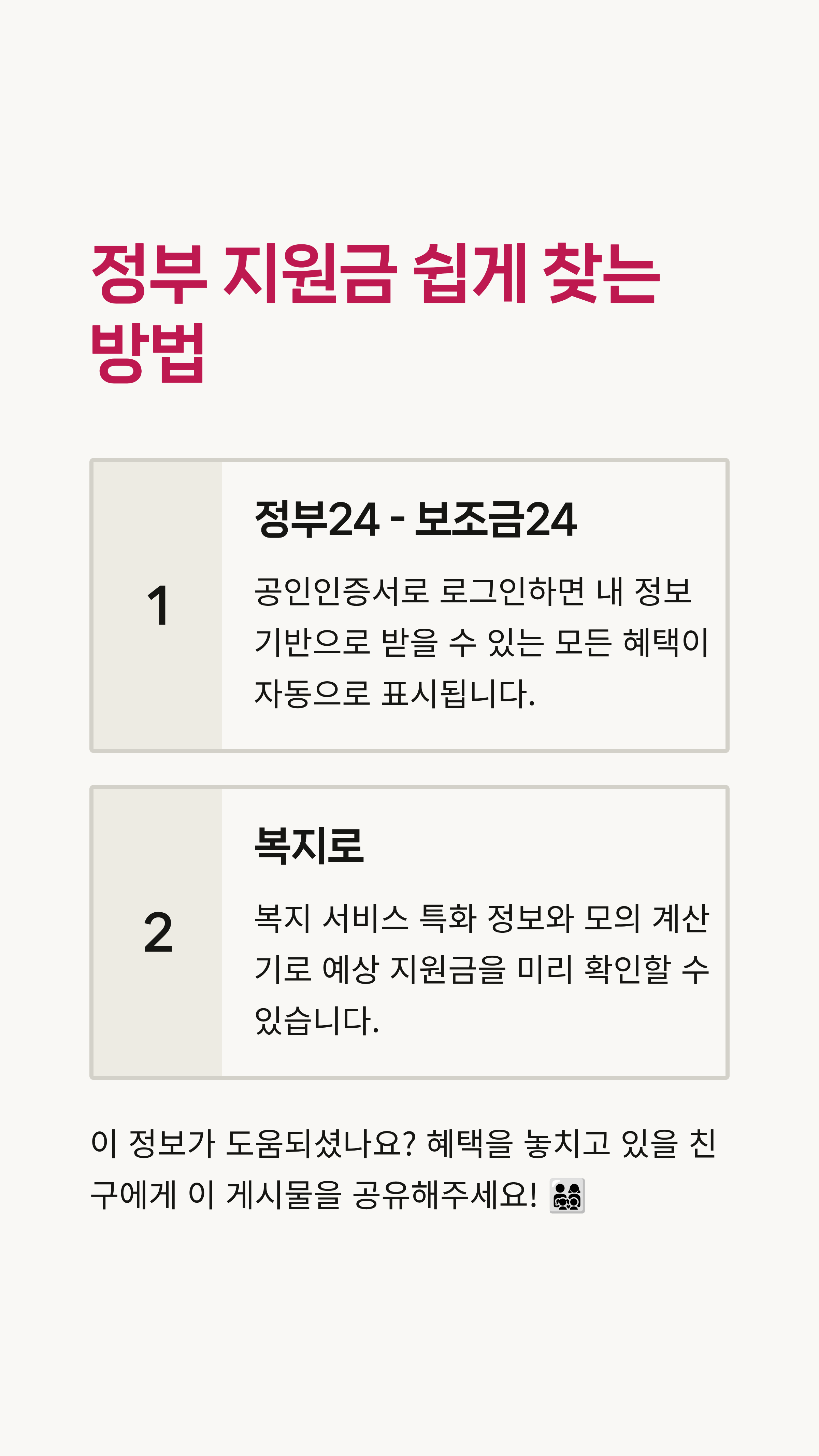 - '정부24 보조금24'와 '복지로'를 적극적으로 활용하세요. 이 두 곳은 나에게 맞는 지원금을 찾는 가장 확실한 공식 채널이에요.