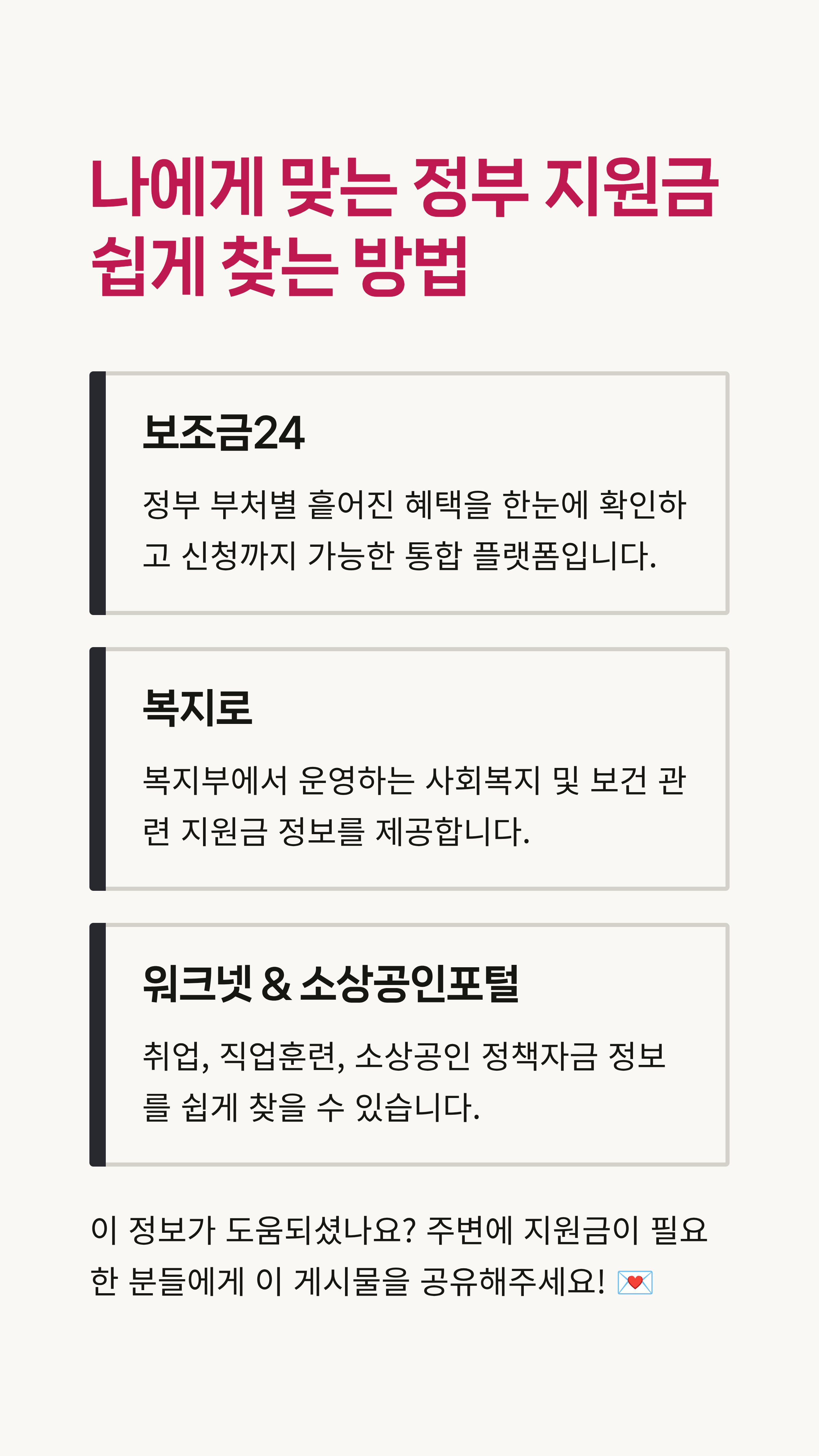 정부 지원금은 멀리 있는 특별한 것이 아니라, 조금만 관심을 가지면 누구나 받을 수 있는 우리 모두의 권리예요. 이 글이 여러분의 삶에 작은 보탬이 되길 바라며, 궁금한 점은 댓글로 편하게 물어봐주세요! 😊