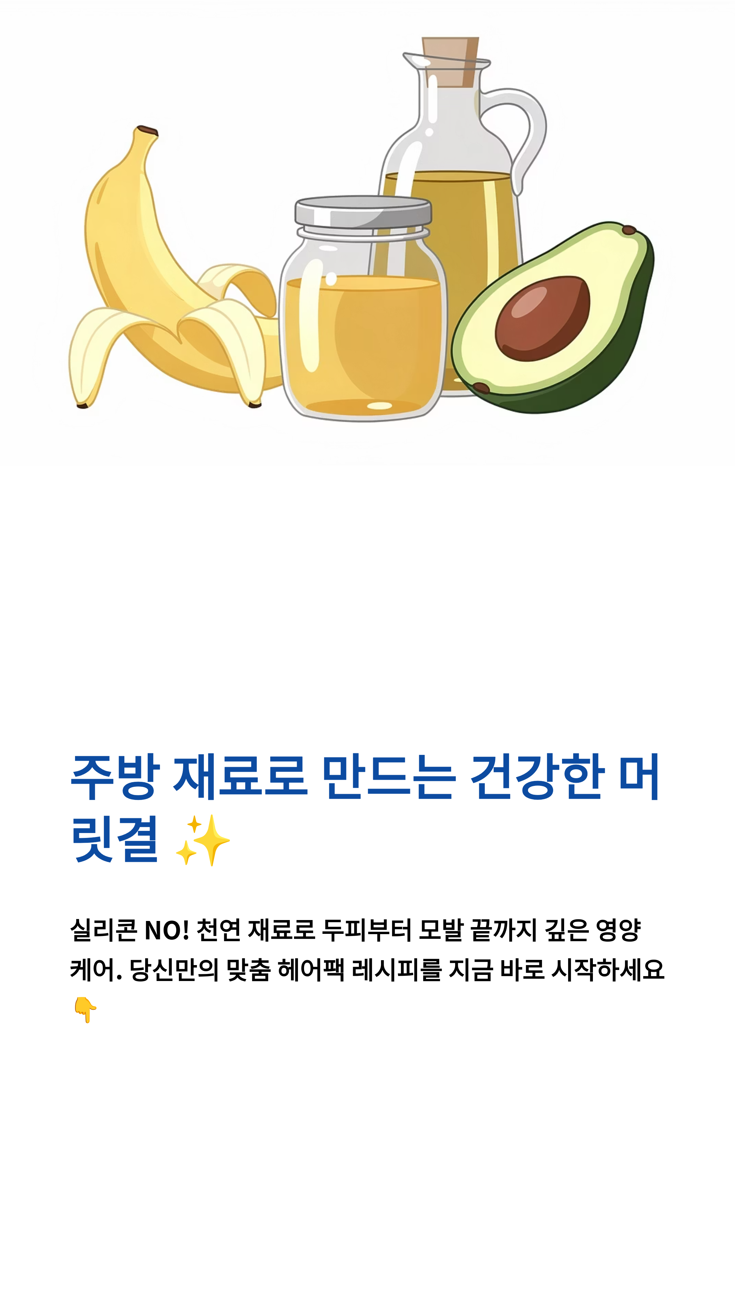 시중에 파는 트리트먼트에는 즉각적인 부드러움을 위해 '실리콘' 성분이 들어가는 경우가 많아요. 당장은 머릿결이 좋아 보일 수 있지만, 장기적으로는 두피의 모공을 막거나 모발의 자생력을 떨어뜨릴 수도 있거든요. 하지만 자연에서 온 재료들은 모발 깊숙이 영양을 직접 전달해 준답니다.