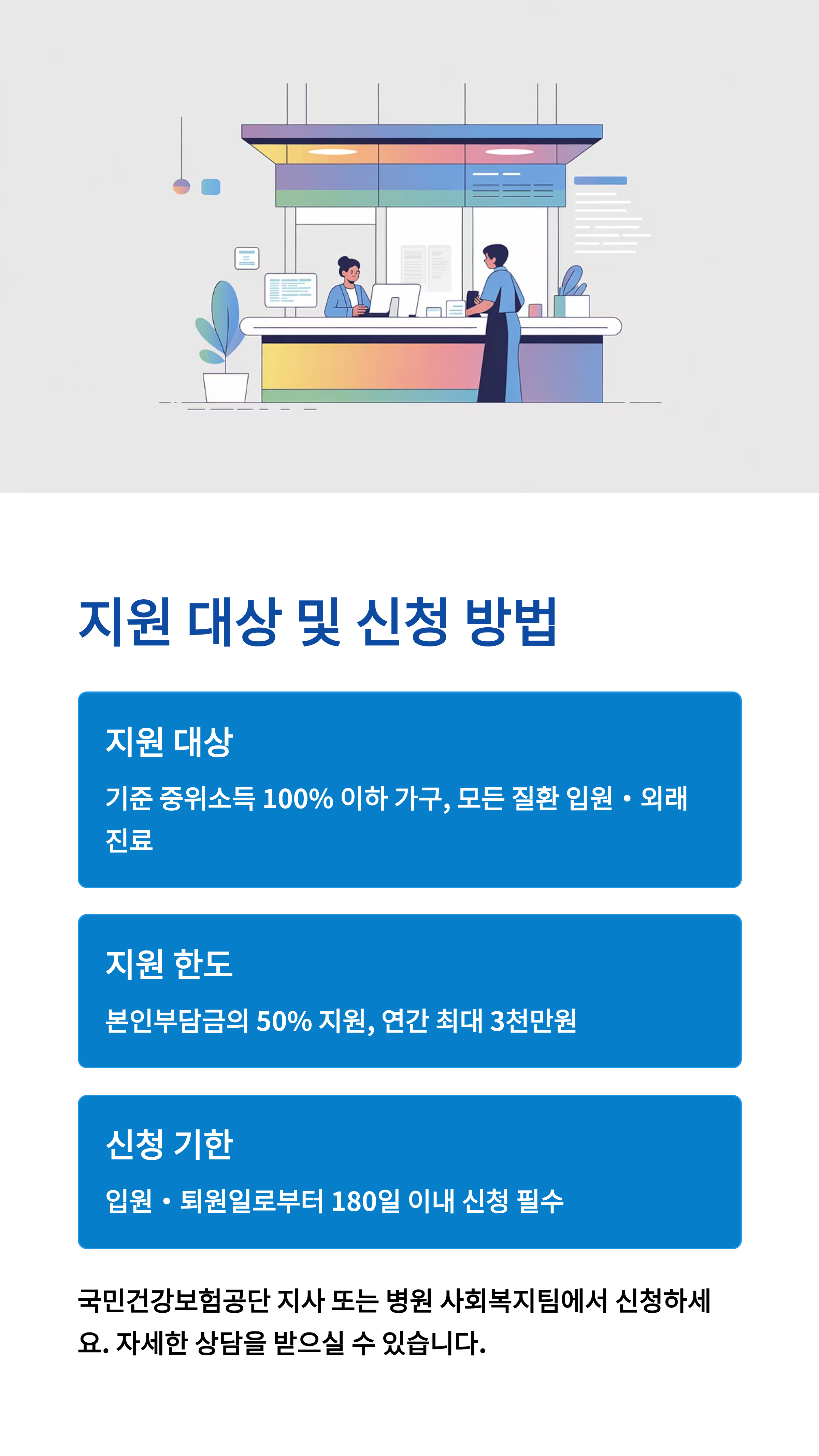 신청 기한(180일)을 놓치면 지원을 받을 수 없으니, 퇴원 직후 또는 의료비 지출이 크게 발생한 시점에 바로 공단 지사나 병원 사회복지팀에 문의하시는 것이 좋습니다. 필요시 대리 신청도 가능해요.