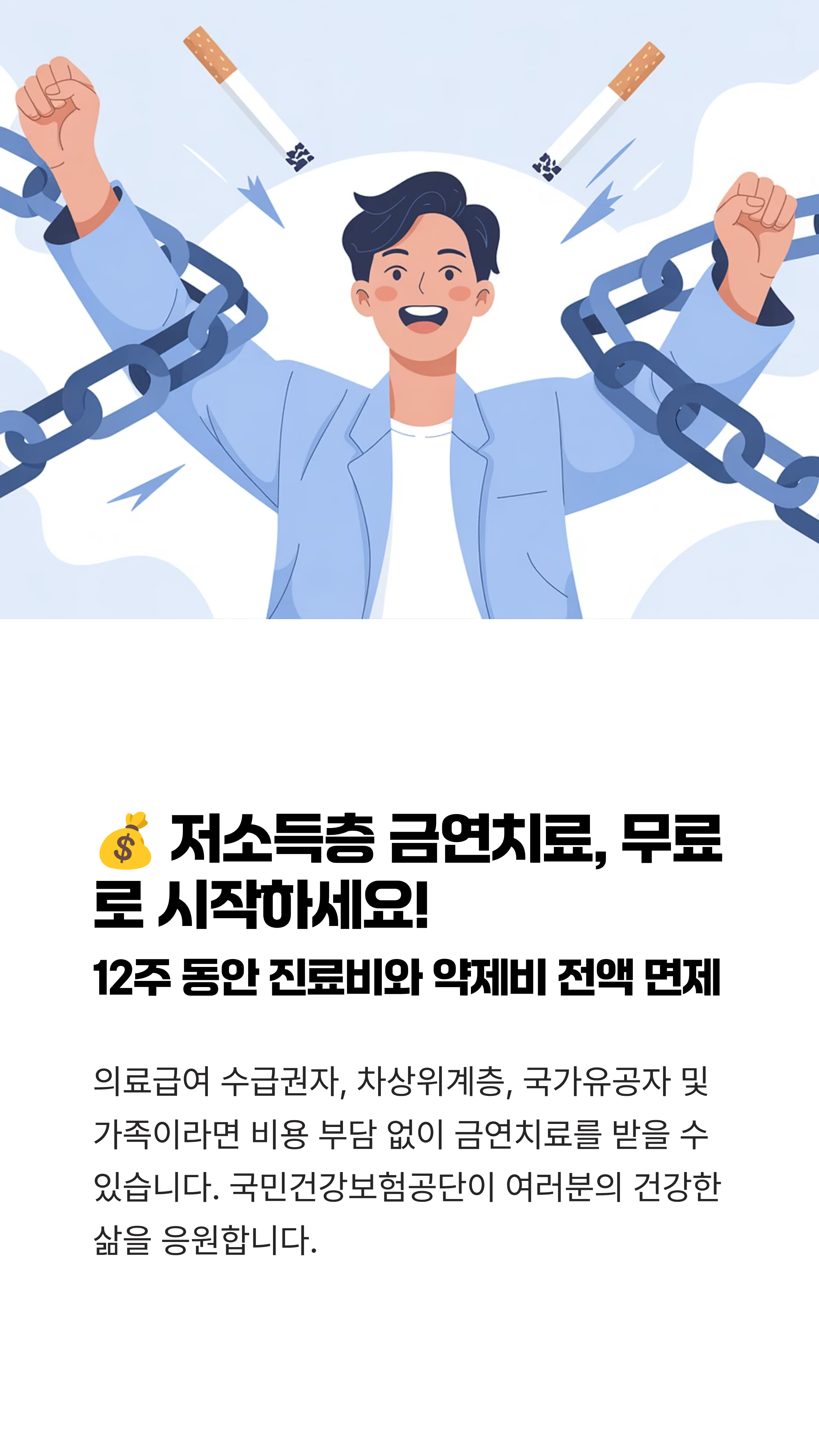 이 사례처럼, 저소득층 지원 제도는 여러분의 경제적 부담을 완전히 덜어주어 오직 금연 성공이라는 목표에만 집중할 수 있도록 도와줍니다. 망설이지 마시고 지금 바로 신청하세요!