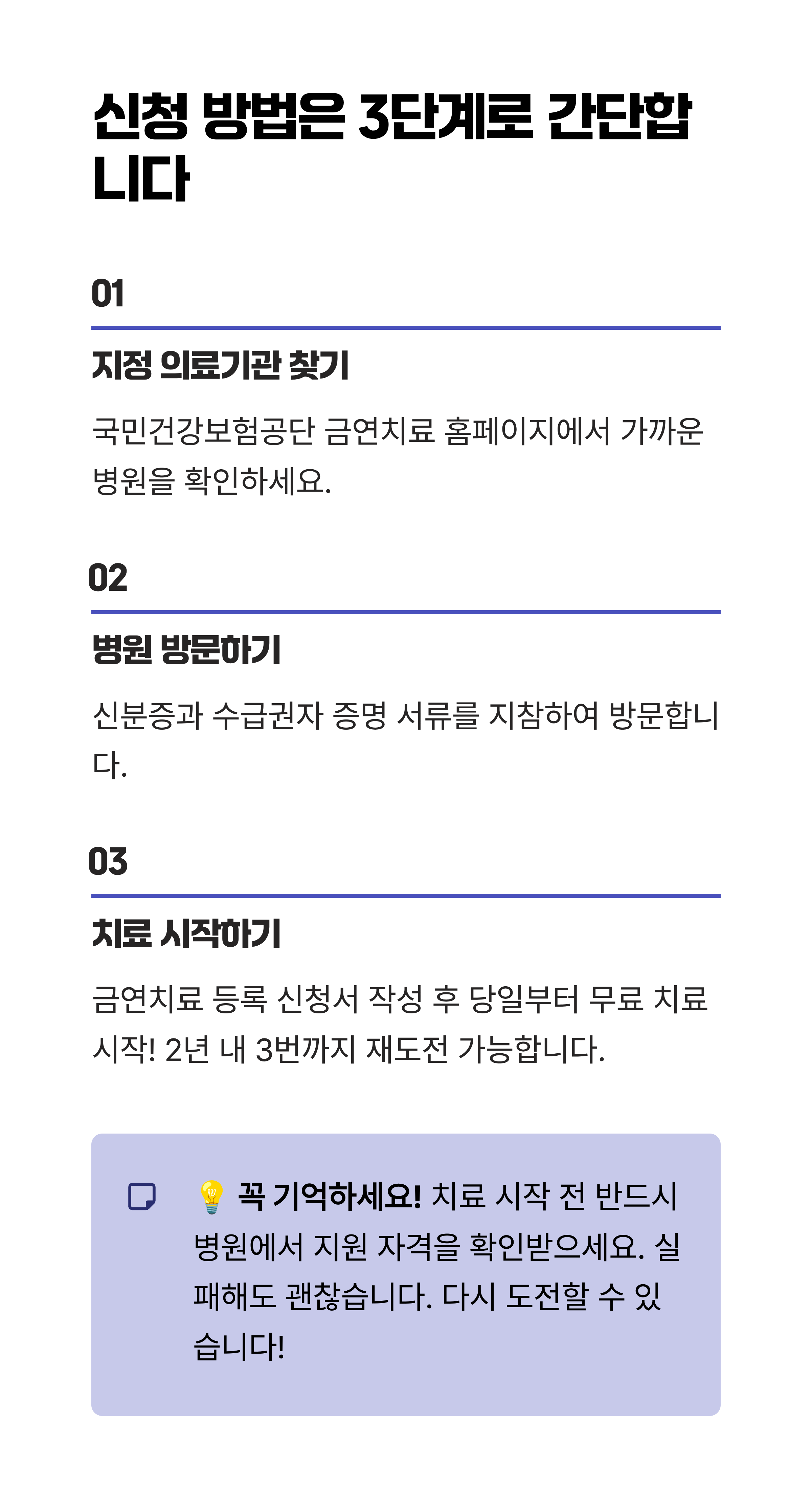 - 세 번째 핵심 포인트. 신청은 금연치료 지정 병원 방문 후 자격 서류 제출로 간단하게 끝납니다.
