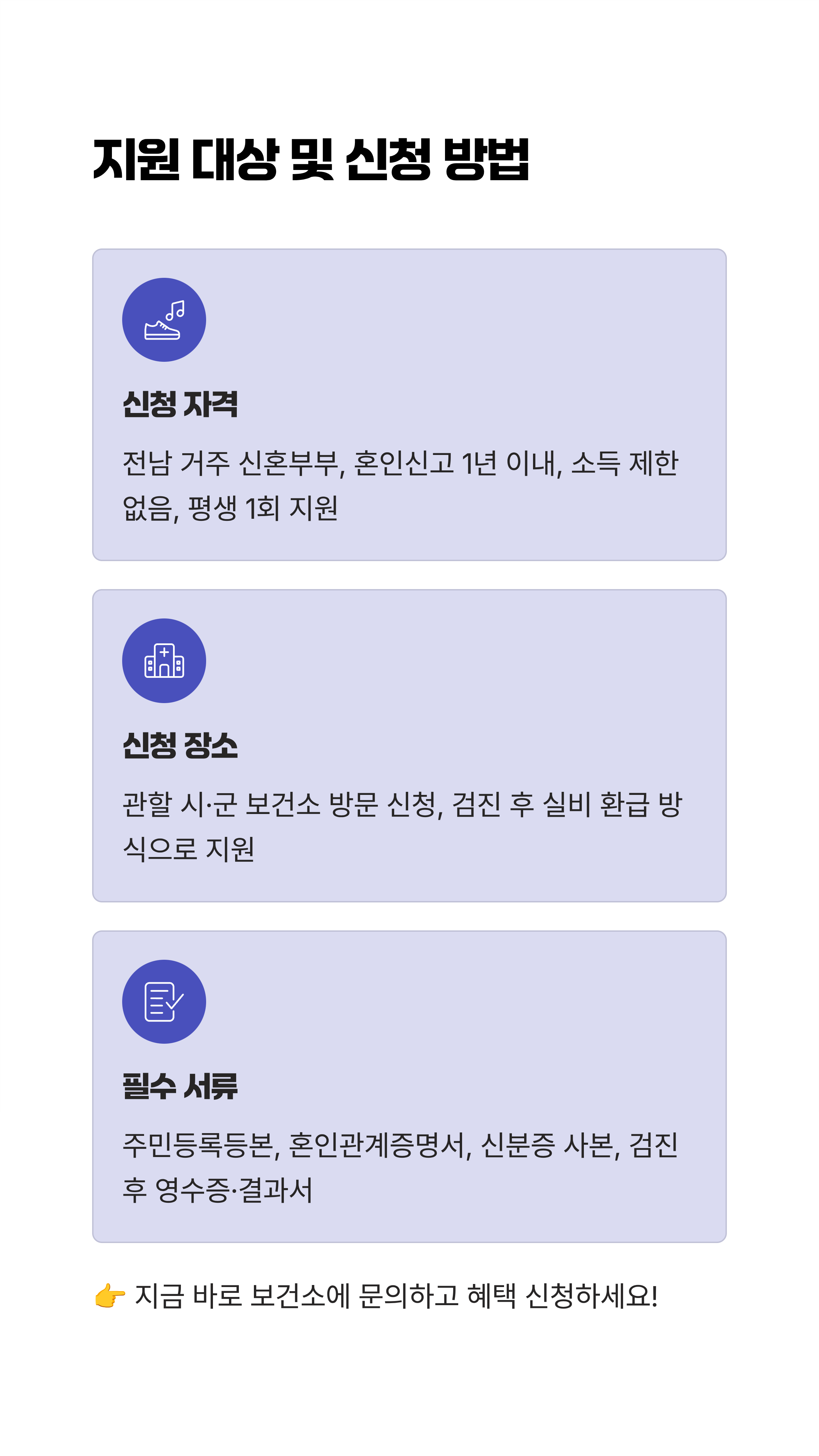 * 지원은 평생 1회만 가능합니다. 이미 지원을 받으셨다면 재신청은 안 돼요. * 지원 금액은 검사 비용의 실비 지원 방식입니다. 검사비를 먼저 납부하시고 나중에 보건소에서 환급받는 형태라는 점, 꼭 기억하세요. * 혼인신고일로부터 1년이 지나기 전에 신청 및 검진을 완료해야 합니다.