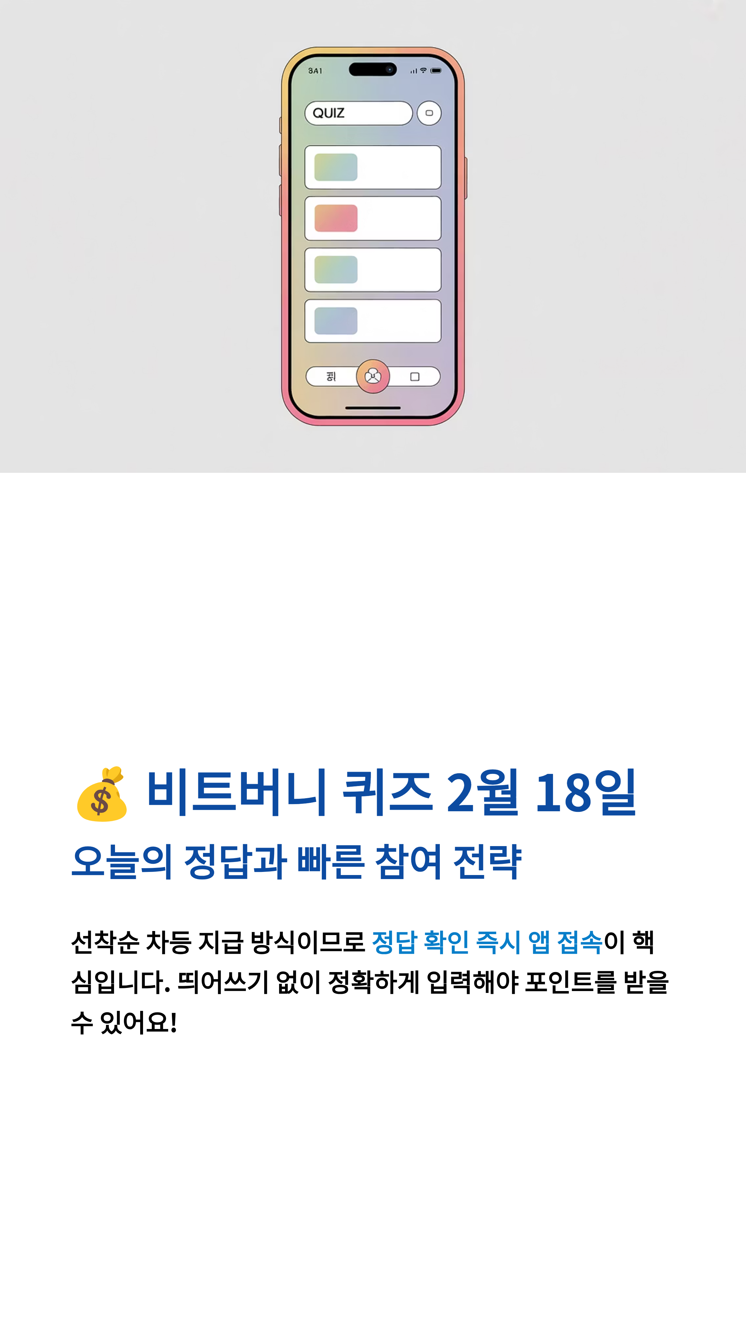 - 두 번째 핵심 포인트. 비트버니 용돈 퀴즈는 **선착순 차등 지급**이므로, **속도**가 생명입니다.